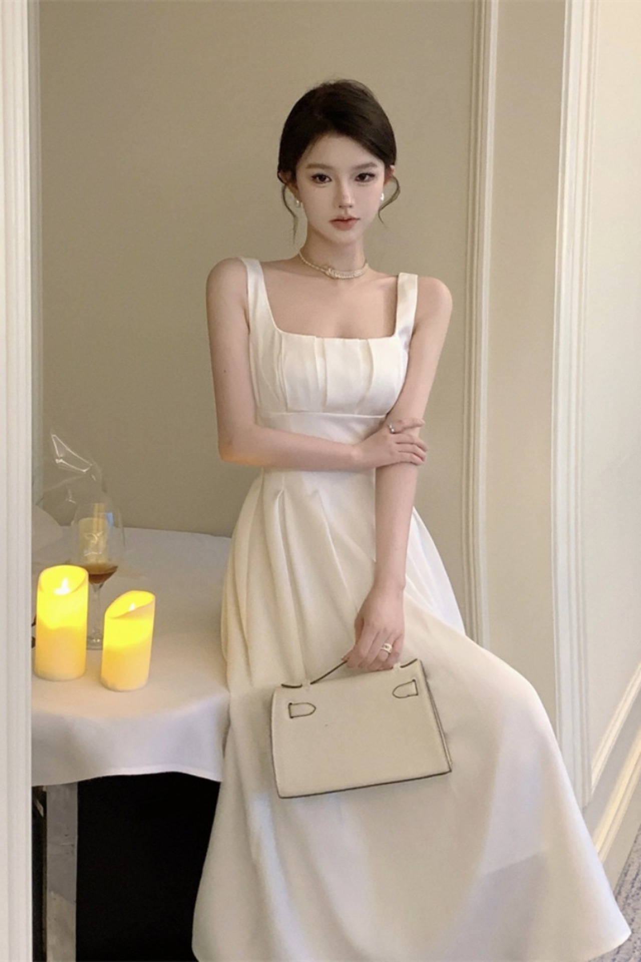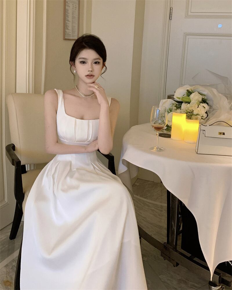 フランスの気質白サテンスリングドレス女性の夏のスクエアカラーノースリーブロングスカート優しい初恋Aラインスカート ホワイト サマー 夏物 スクウェア bstraw57102033655 | beaute25