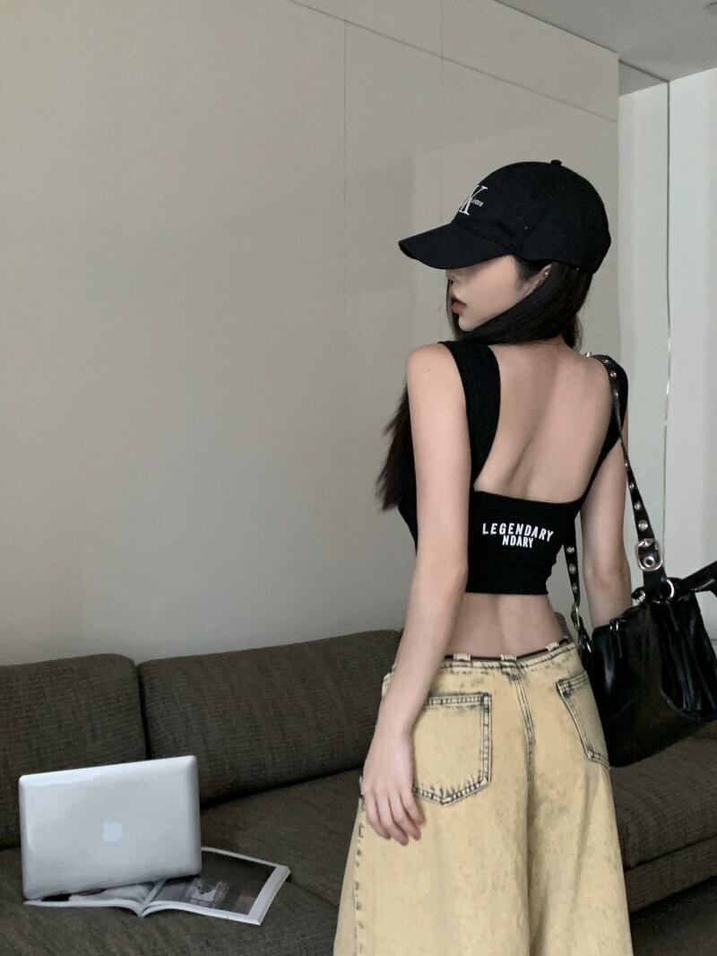 黒文字プリント ノースリーブ ベスト レディース 夏 ショート スタイル インナー デザイン センス ホルター トップ アウター ブラック サマー 夏物 bstraw55162932100 | beaute25