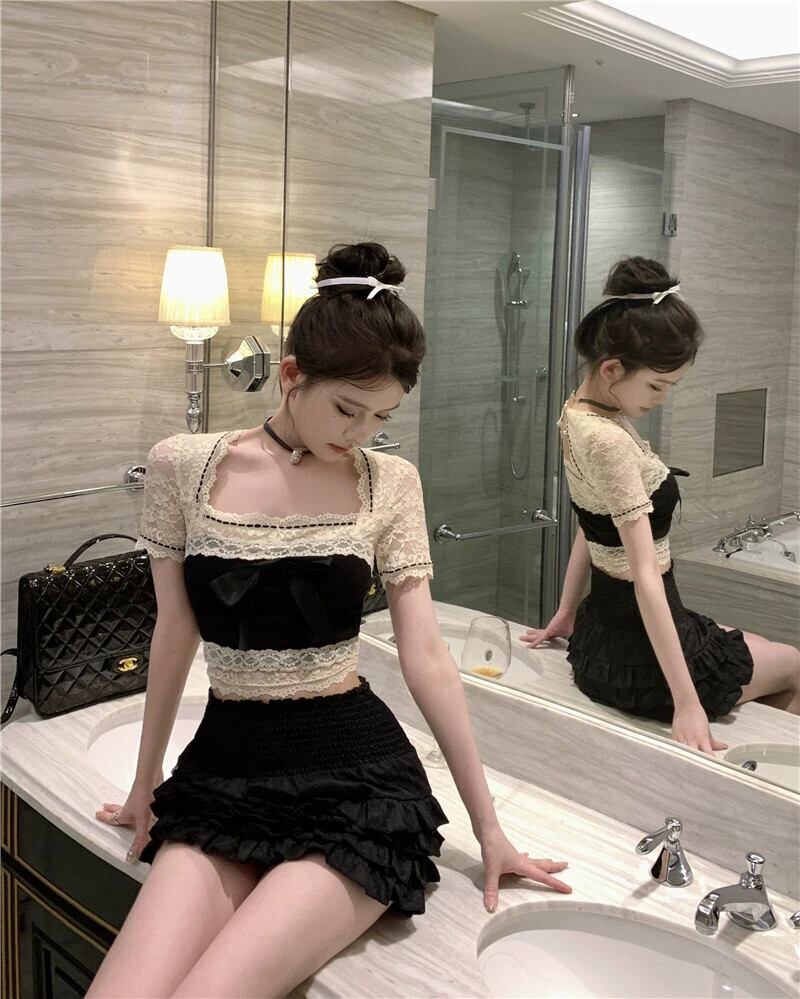 レーススプライシング重工業リボン半袖トップ女性の夏フレンチスクエアカラーショート甘くてスパイシーなニッチセクシーな Tシャツ 大人ガーリー スウィート キュート カジュアル サマー 夏物 スクウェア bstraw59125385128 | beaute25