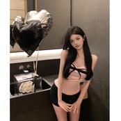 ピンクサテンちょう結びフィッシュボーンチューブトップトップ女性の夏の純粋な欲望の摩耗ショートノースリーブ胸ラップベスト リボン 半袖 ハーフスリーブ サマー 夏物 ピュア bstraw84399525228 | beaute25
