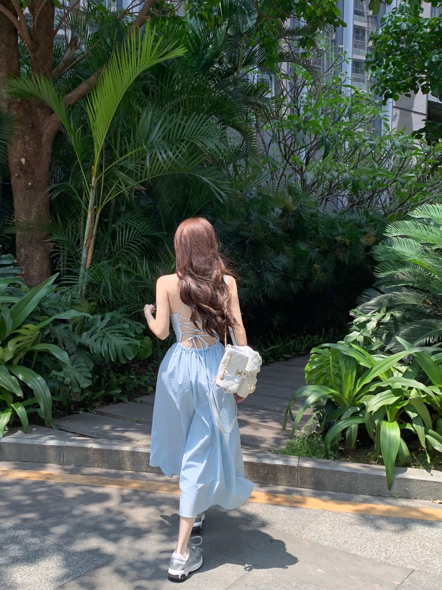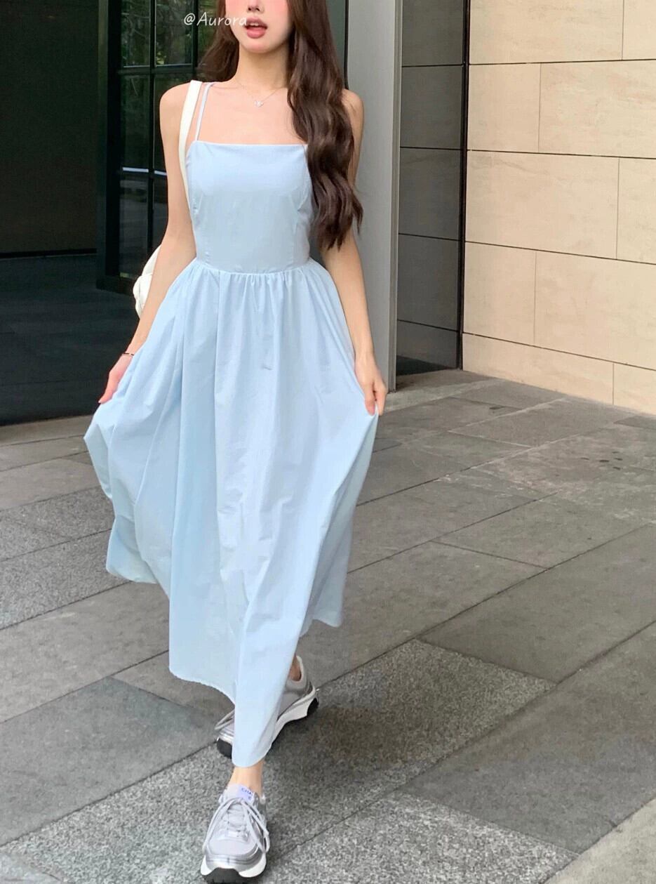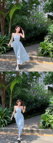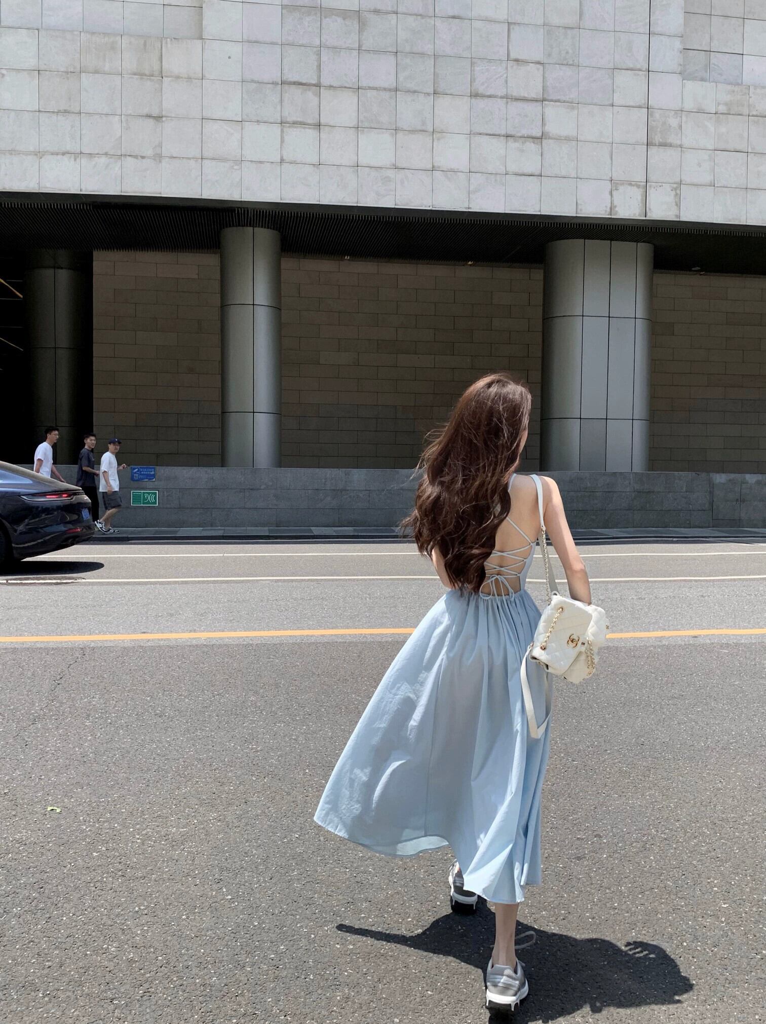 ブルー美しいバックサスペンダードレス女性の夏のワンショルダー純粋な欲望ウエストバックレスミッドレングススカートストラップ付きaラインスカート サマー 夏物 ピュア bstraw45906498710 | beaute25
