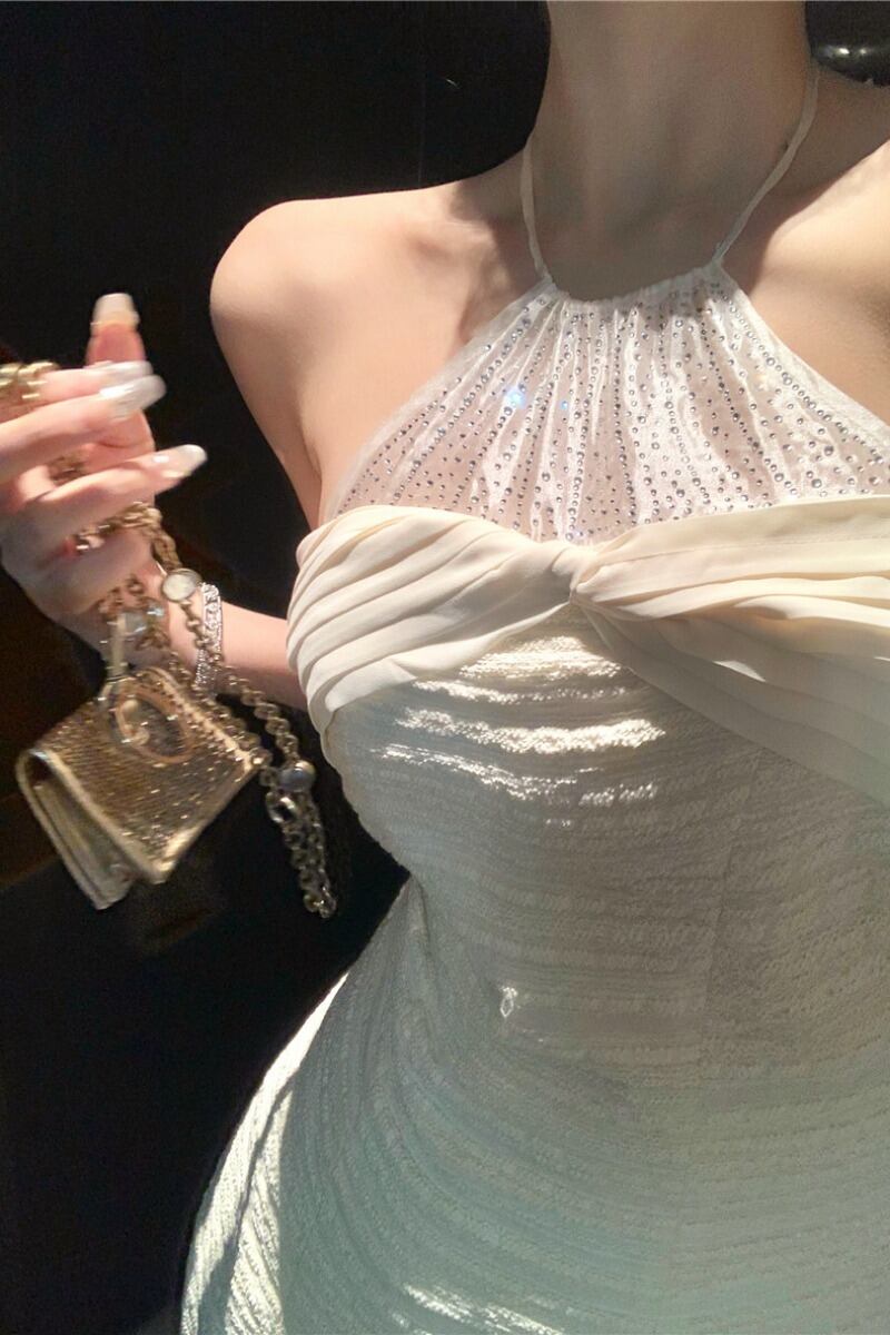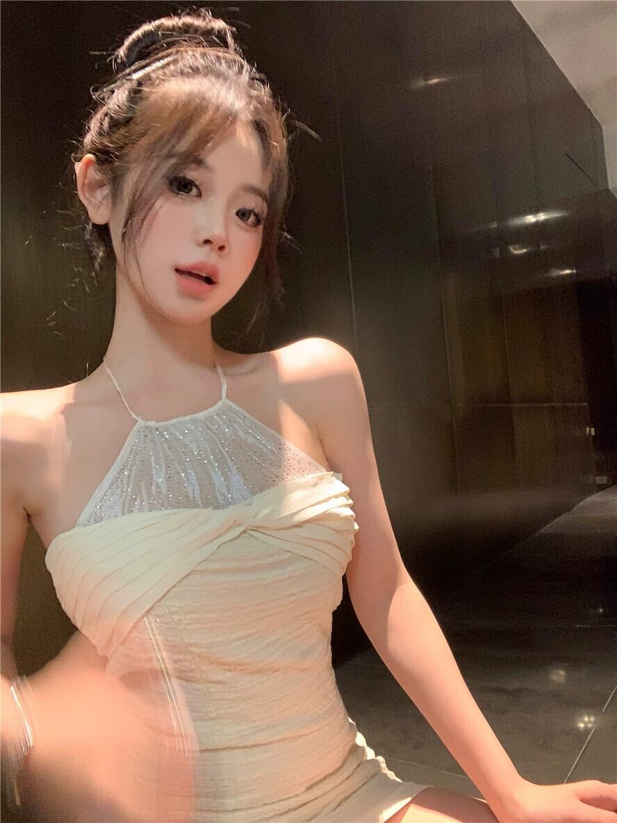 純粋な欲望のバックレスホルターネックストラップドレス女性の夏スプライシングメッシュバッグヒップスカート重工業ダイヤモンドがちりばめられたアプリコットスカート サマー 夏物 bstraw82444411224 | beaute25