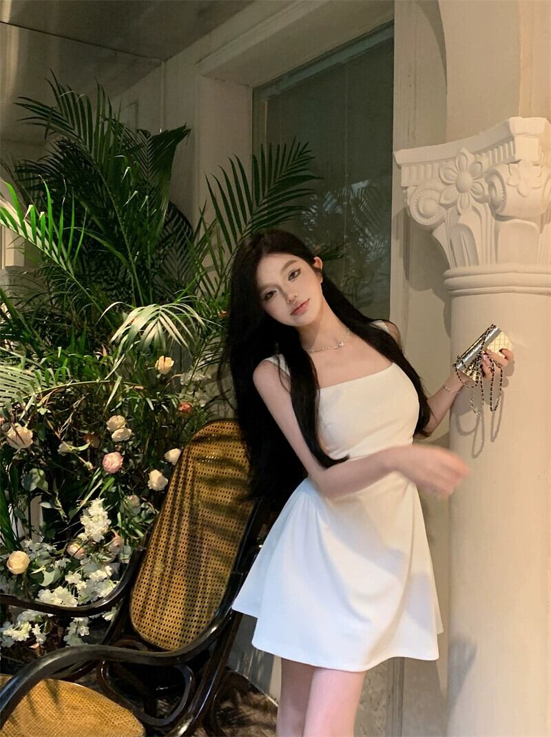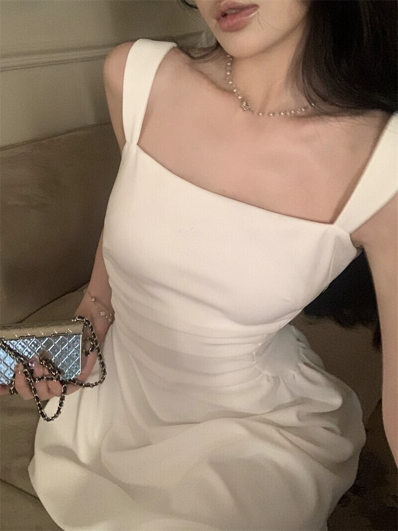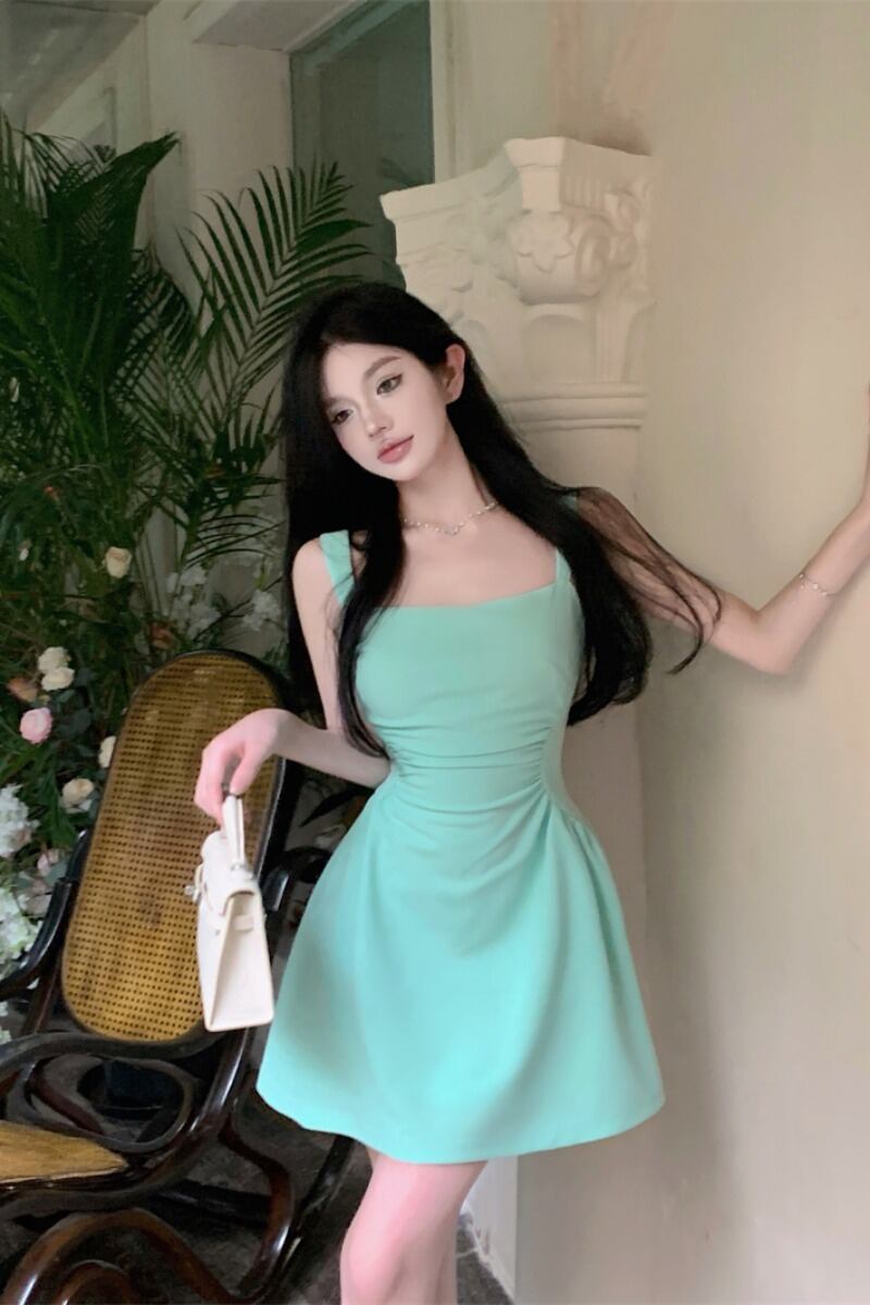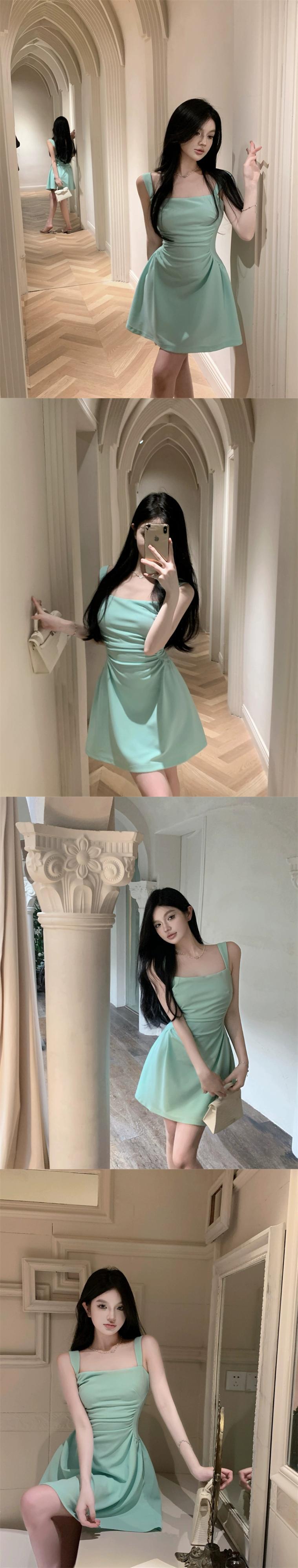 グリーンスクエアカラーサスペンダードレス女性の夏の純粋な欲望ノースリーブベストショートスカート気質ウエストaラインスカート サマー 夏物 ピュア スクウェア bstraw12574158964 | beaute25