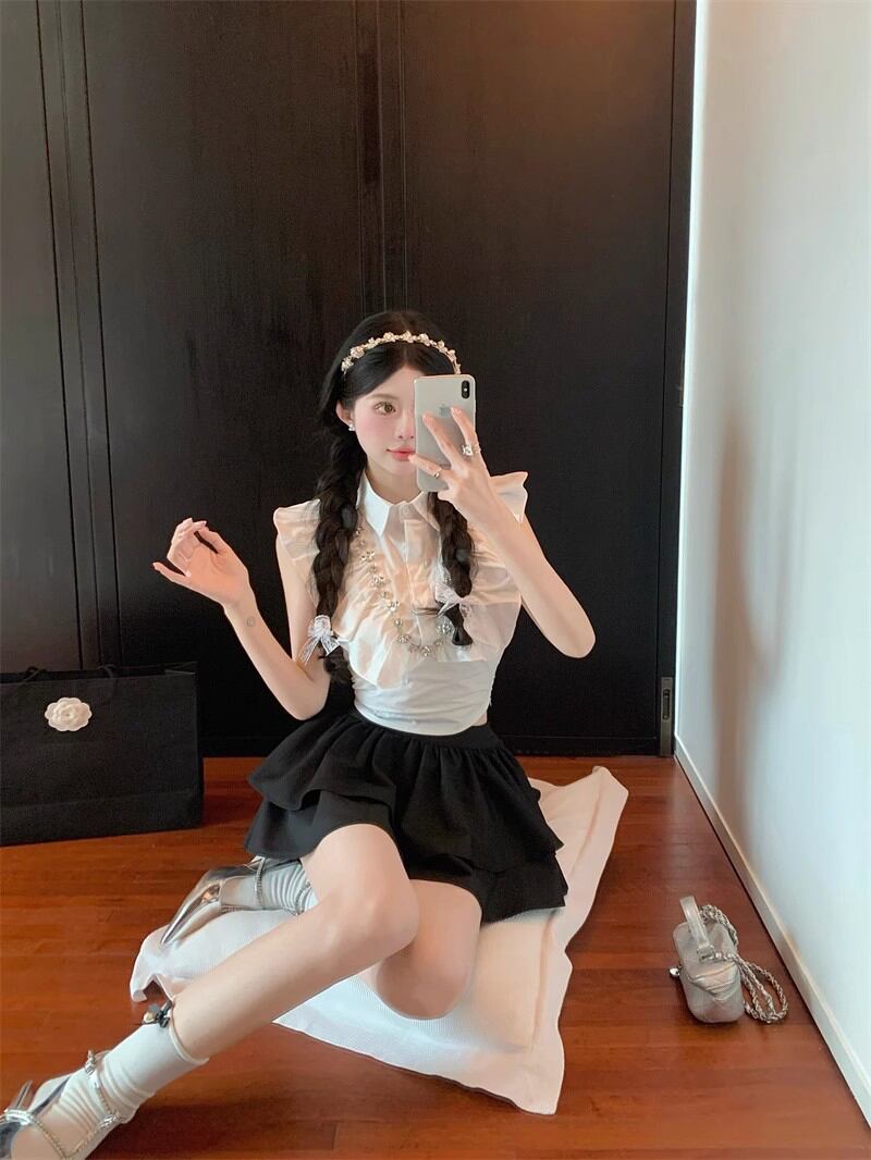 蓮の葉のエッジプリーツ小さなフライングスリーブシャツ女性の夏のラインストーンショート白シャツポロ襟ニッチノースリーブトップ ホワイト サマー 夏物 bstraw65049244749 | beaute25