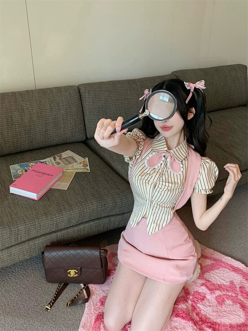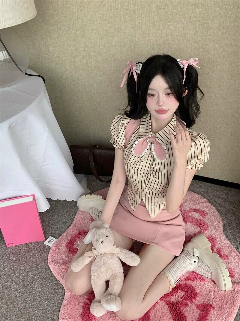 甘いポロカラーストライプパフスリーブシャツレディース夏不規則スリムスリムショートシャツ気質トップ 大人ガーリー スウィート キュート カジュアル サマー 夏物 bstraw93335417611 | beaute25