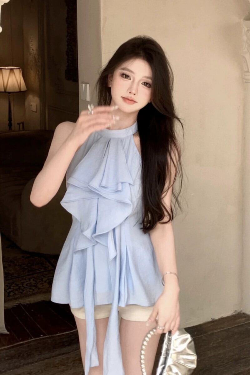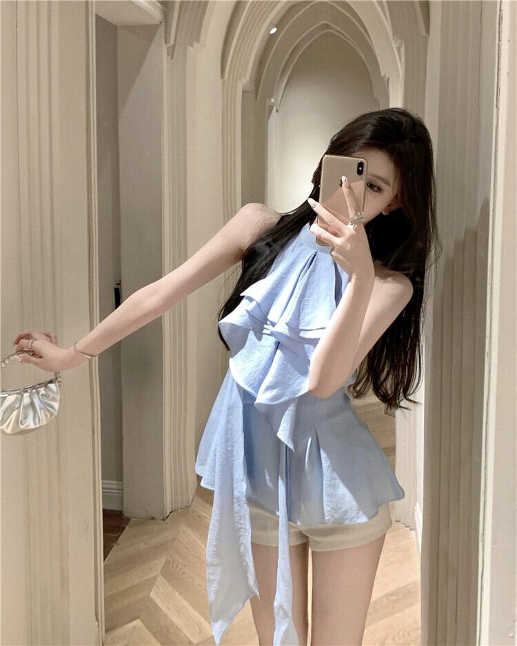 純粋な欲望不規則な吊りネックベスト女性の夏のアウターウェアフリル甘いトップノースリーブブルーホルターストラップ 大人ガーリー スウィート キュート カジュアル サマー 夏物 bstraw74333059165 | beaute25