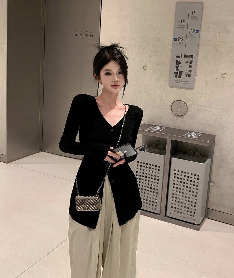 黒の気質の V ネックニットカーディガン女性のデザインセンスニッチ夏スリムフィット薄手のコート日焼け止めトップ ブラック サマー 夏物 Vネック bstraw10104251220 | beaute25