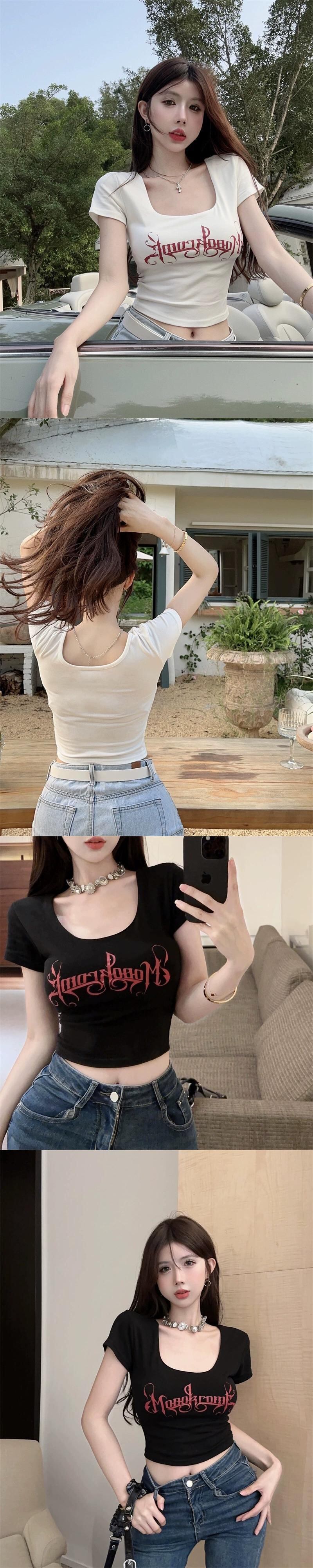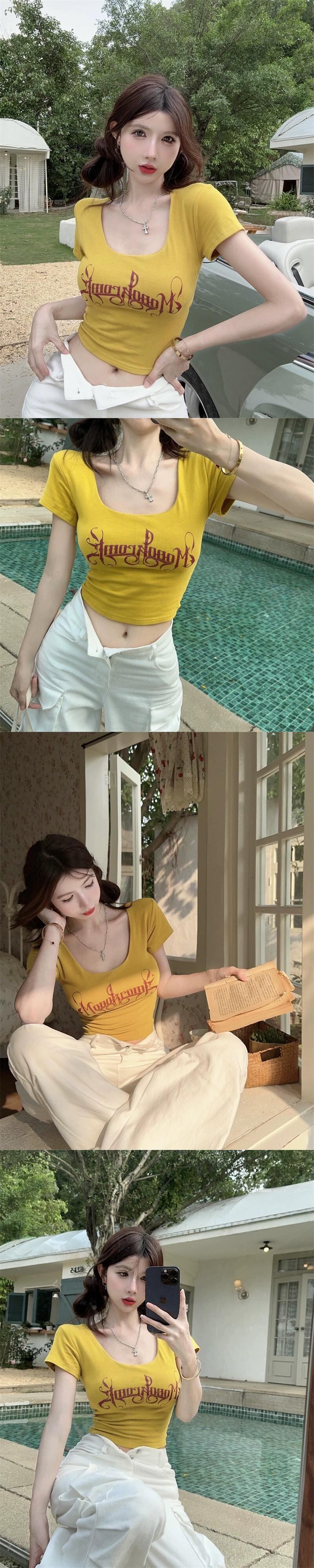 ホワイトフロントショルダースクエアカラー半袖Tシャツレディース夏純粋な欲望風y2kレター甘いタイトフィットへそショートトップ 大人ガーリー スウィート キュート カジュアル サマー 夏物 ピュア スクウェア bstraw67561382882 | beaute25