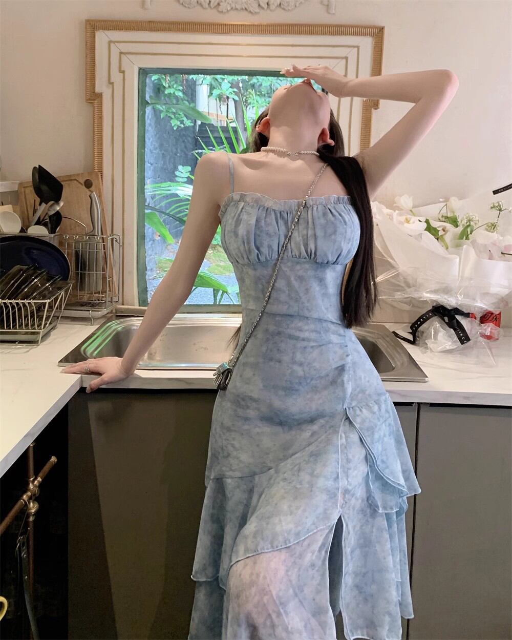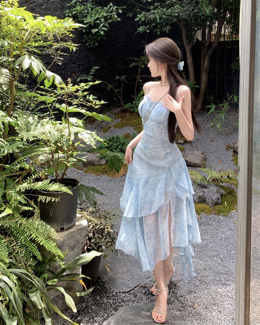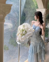 花柄シフォンスリングドレス レディース 夏 スーパーフェアリー フリル イレギュラー ロングスカート ウエストスリット ブルースカート サマー 夏物 bstraw17160166847 | beaute25