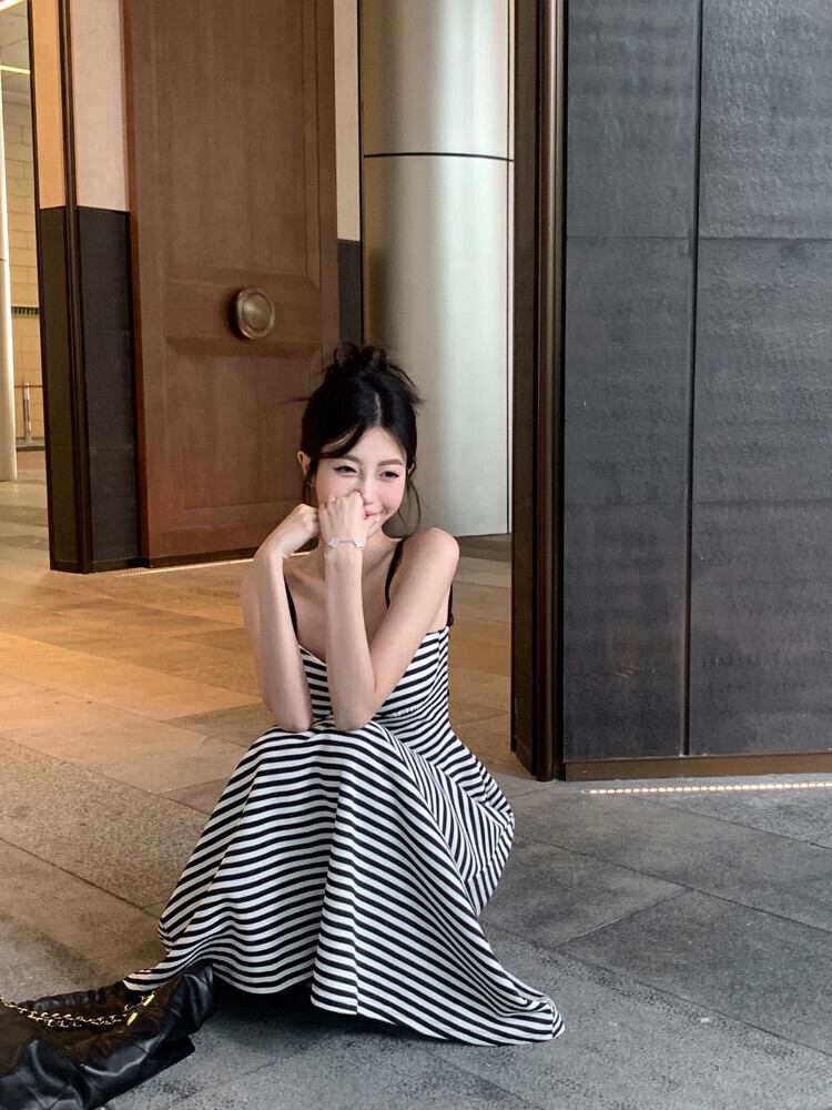 黒と白のストライプのバックレスサスペンダードレス女性の夏スリムウエストセクシーなロングスカートノースリーブカジュアルaラインスカート ホワイト ブラック サマー 夏物 bstraw77631744479 | beaute25