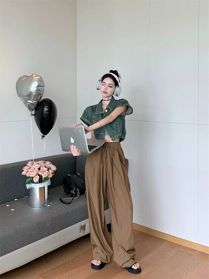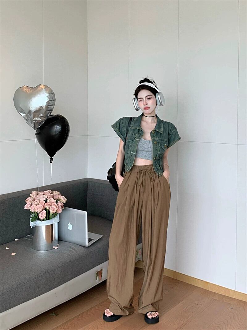 怠惰なスタイルのレトロなストラップカジュアルパンツ女性の夏の薄いセクション弾性ウエストルーズスリムストレートパンツワイドレッグパンツ エラスティック 伸縮 サマー 夏物 ワイドパンツ bstraw43767069890 | beaute25