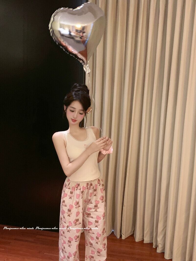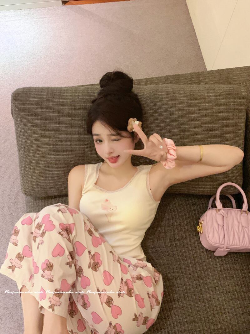 漫画かわいいホームサービスツーピースセット女性の夏のレースのベストサスペンダーパジャマカジュアルワイドレッグパンツパジャマスーツ 大人ガーリー スウィート キュート サマー 夏物 bstraw85322221821 | beaute25