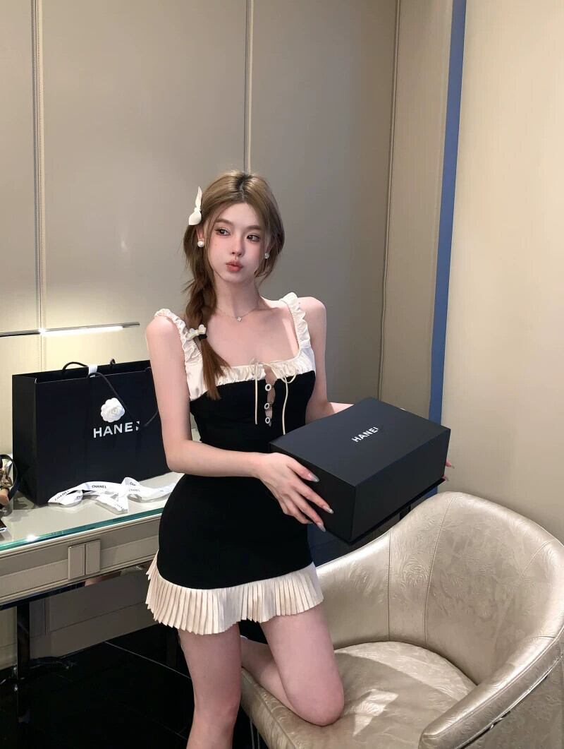 フレンチレトロなカラーコントラストステッチプリーツサスペンダードレス女性の夏のウエストストラッププリーツスカートセクシーなスカート サマー 夏物 bstraw53491361925 | beaute25