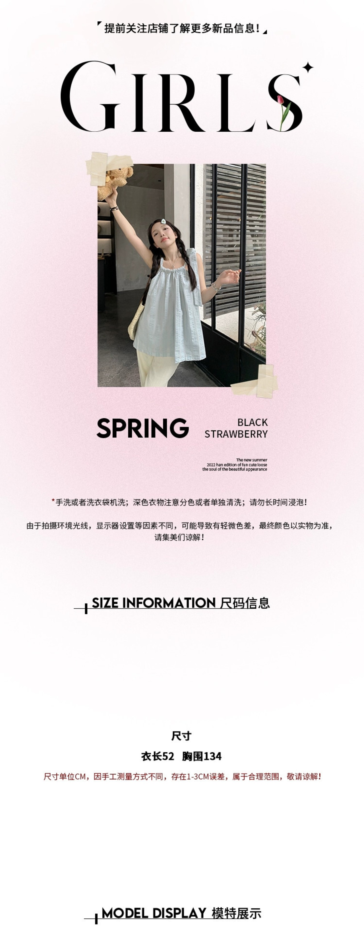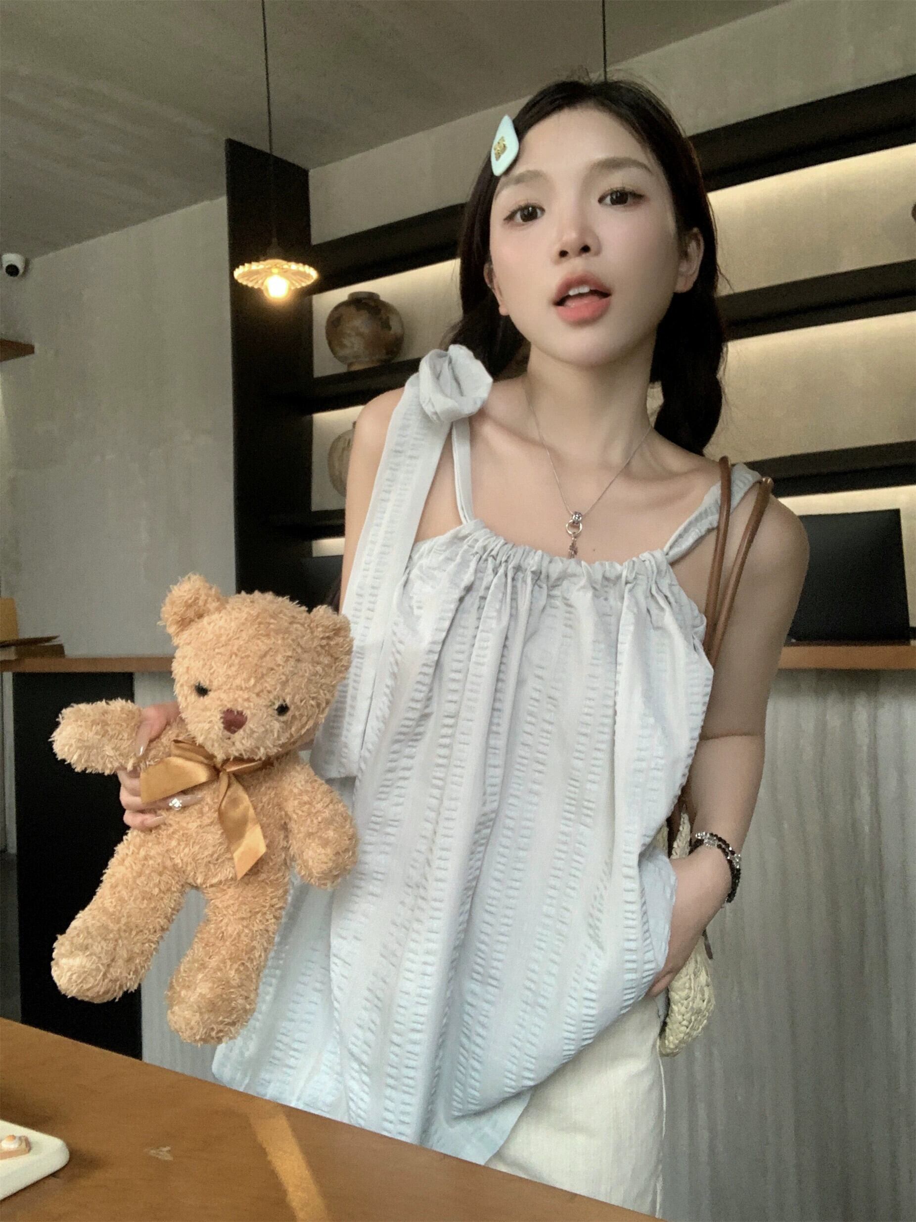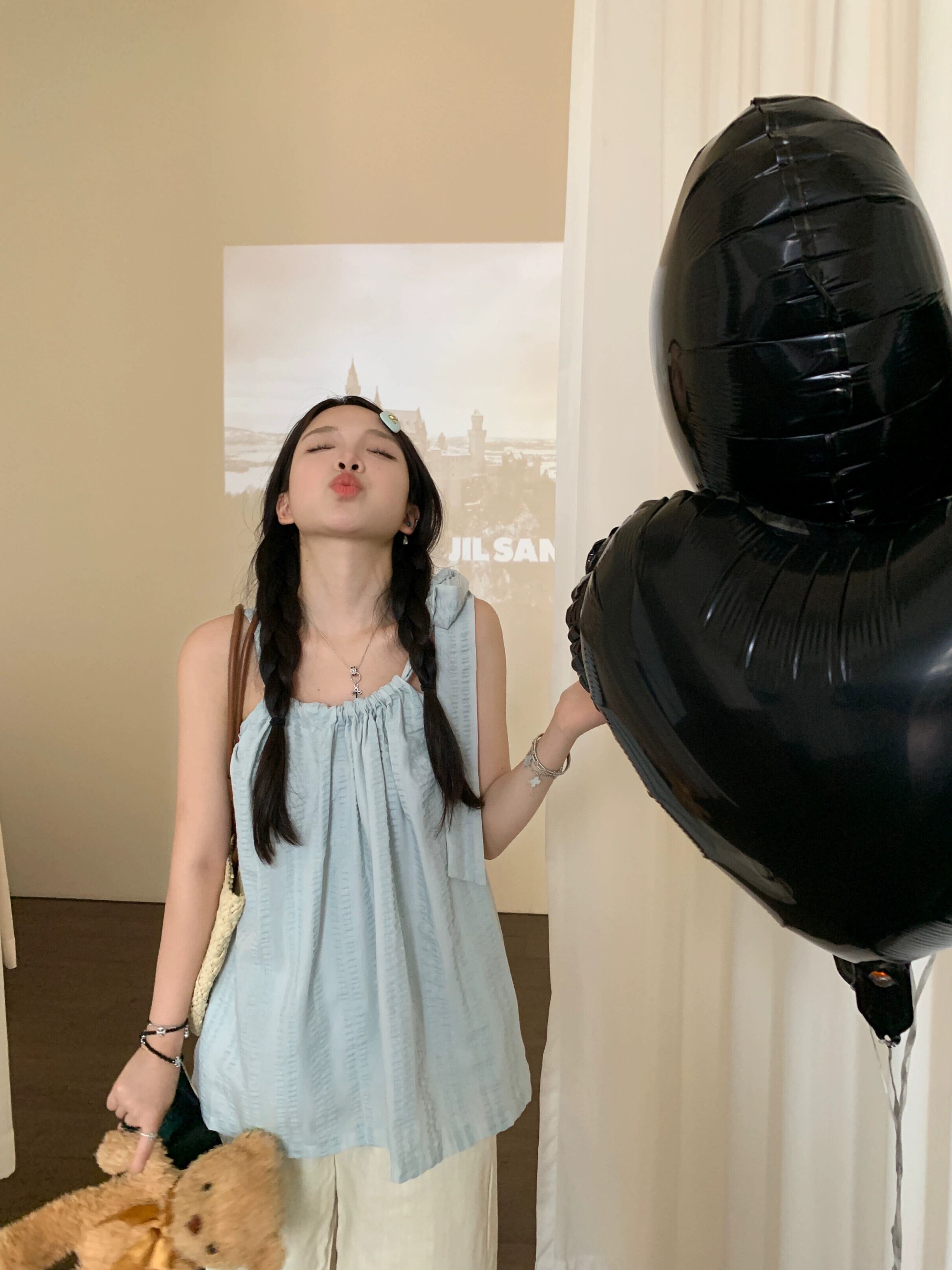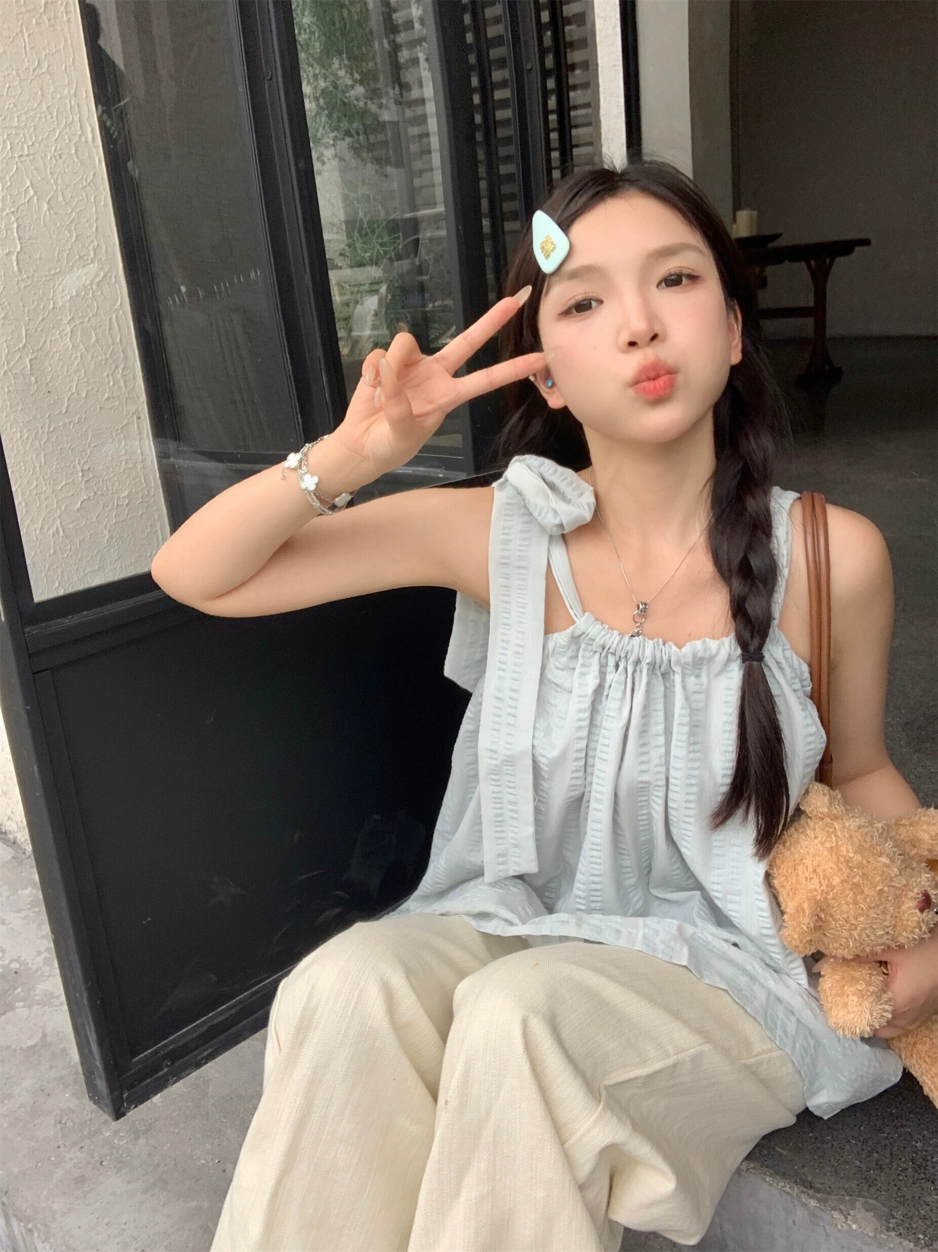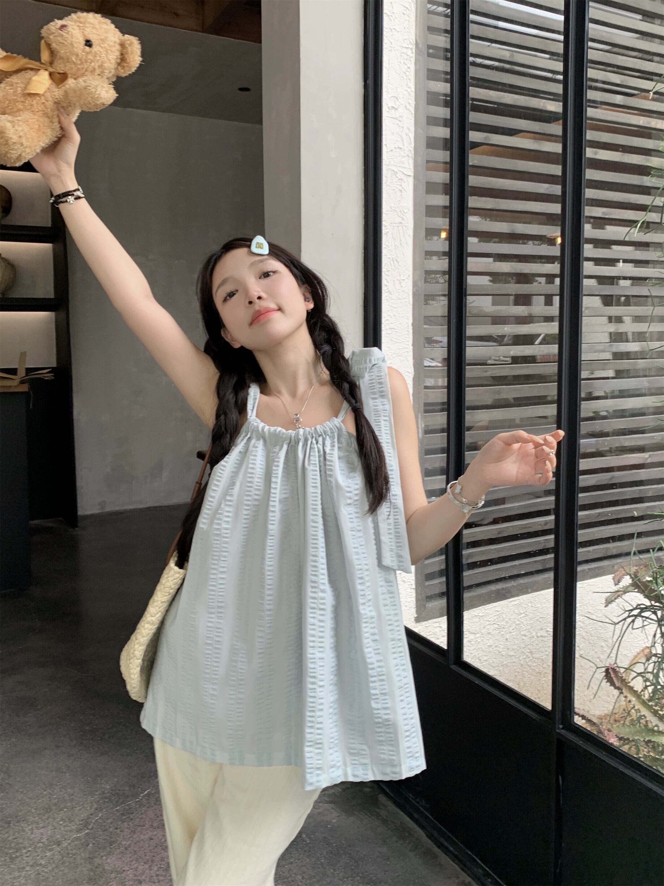 ゆったりとしたブルーのノースリーブベストスリング女性の夏のアウター、小さく新鮮で甘い肌を見せ、薄いホルターストラップトップ 大人ガーリー スウィート キュート カジュアル サマー 夏物 bstraw33018228847 | beaute25