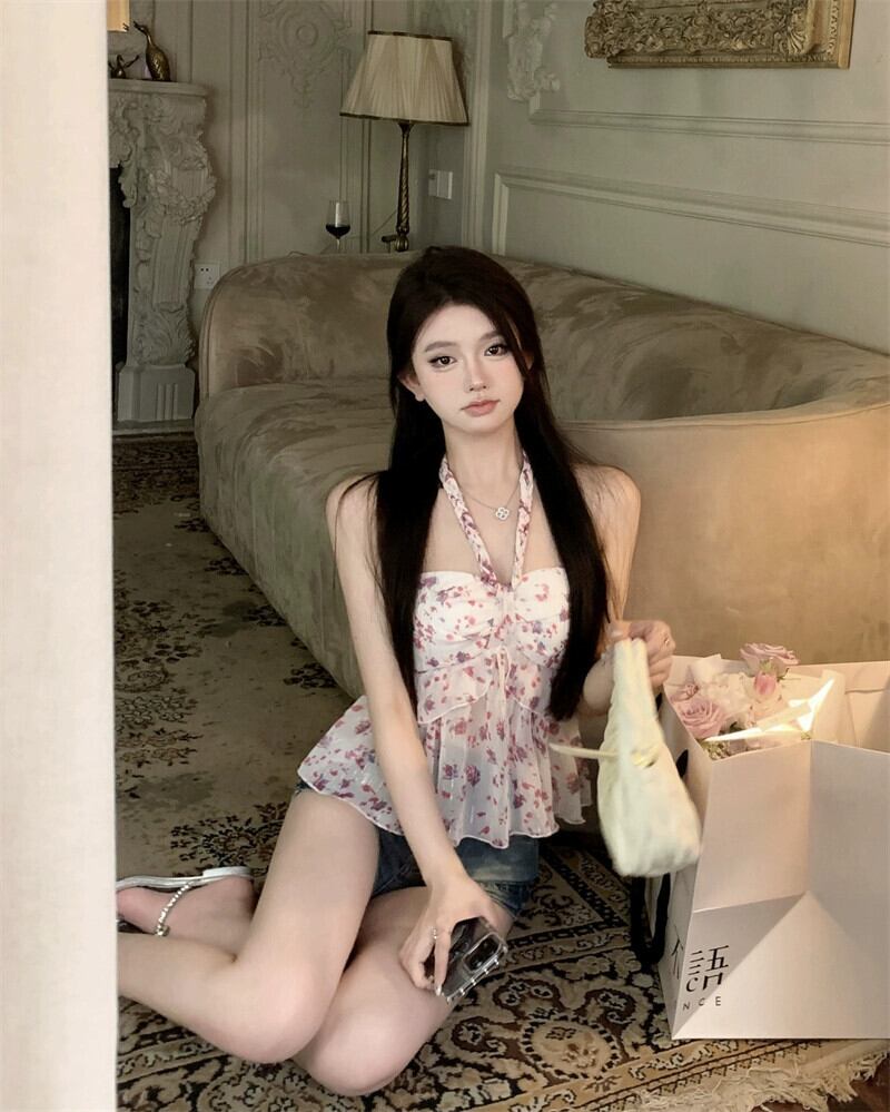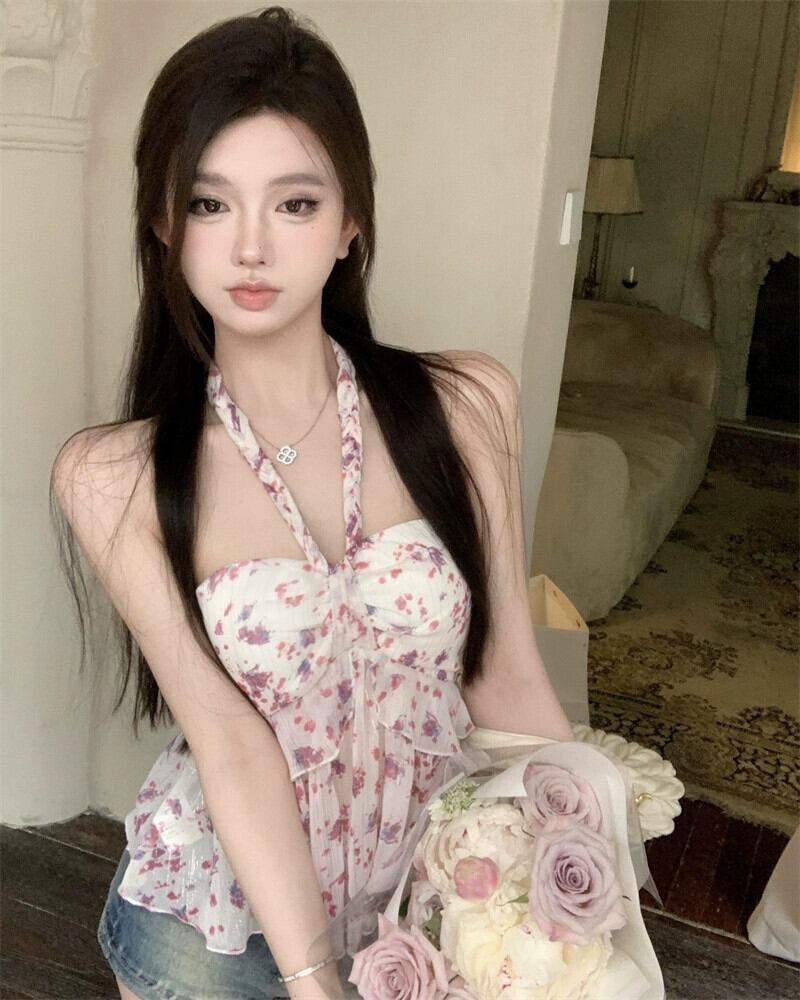 純粋な欲望の壊れた花の首をぶら下げキャミソール女性の夏の甘い短いフリルの青いホルター トップを着ています。 ショート ブルー 大人ガーリー スウィート キュート カジュアル サマー 夏物 フラワーデザイン bstraw92092223018 | beaute25