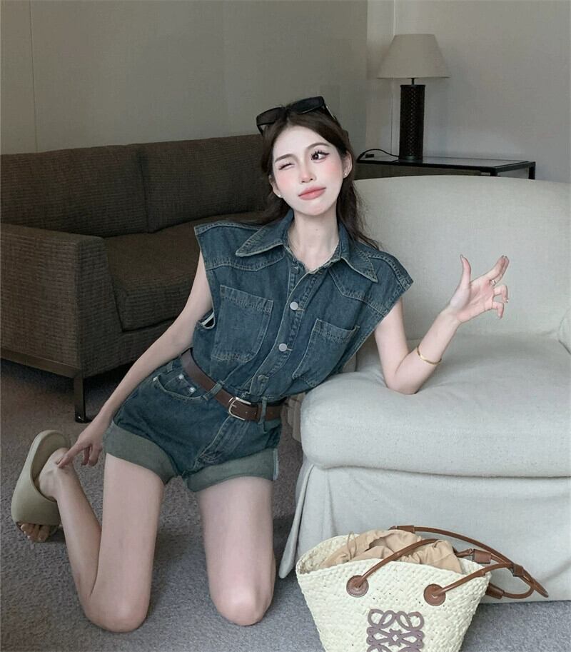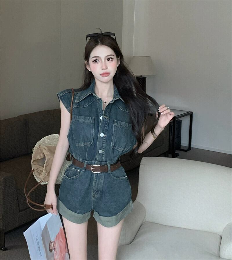 レトロな甘いクールなデニムジャンプスーツの女性の夏の小さなジャンプスーツショートパンツは薄いワイドレッグパンツをめくりました 大人ガーリー スウィート キュート カジュアル サマー 夏物 ショーツ ブルマー bstraw96224011386 | beaute25