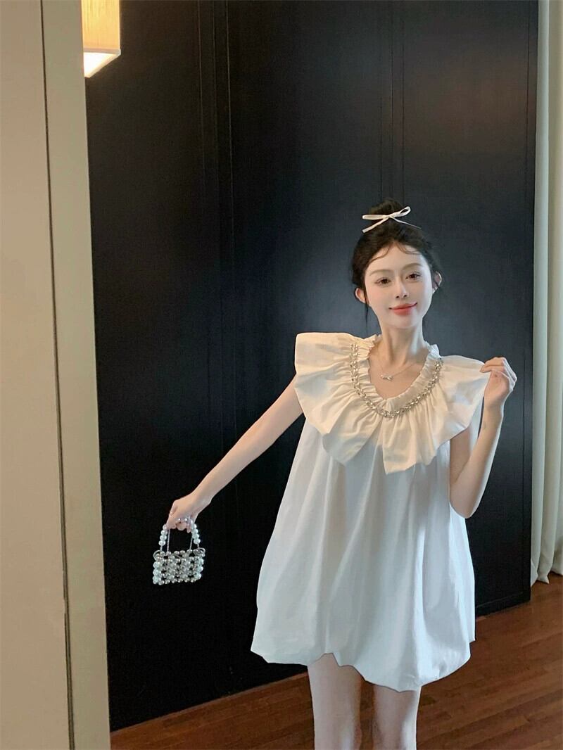 白い甘いドレス女性の夏のフリル芽スカートデザインセンスニッチ V ネックラインストーン A ラインスカート ホワイト 大人ガーリー スウィート キュート カジュアル サマー 夏物 Vネック Aライン bstraw53517054576 | beaute25