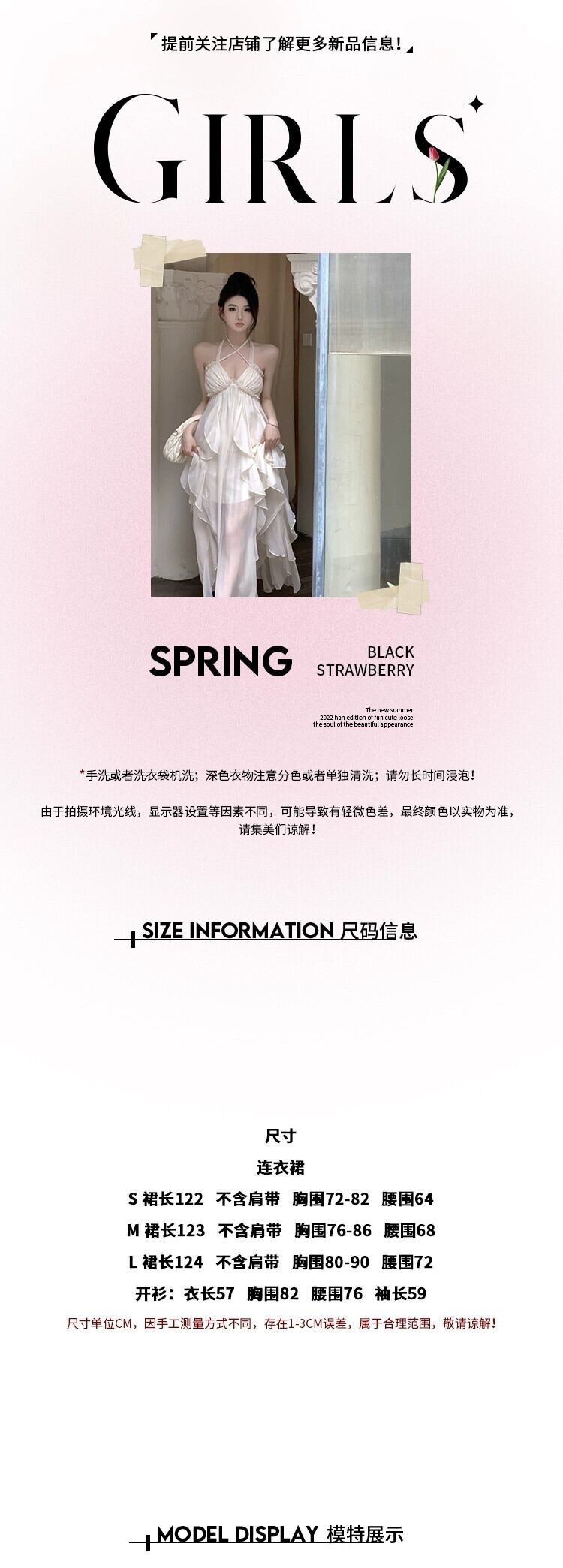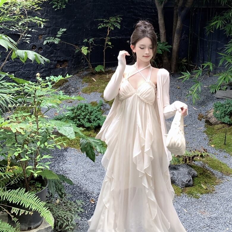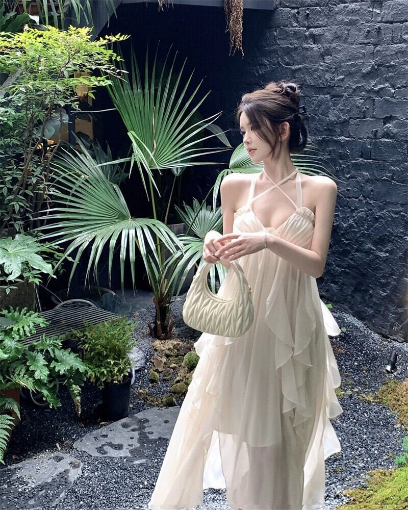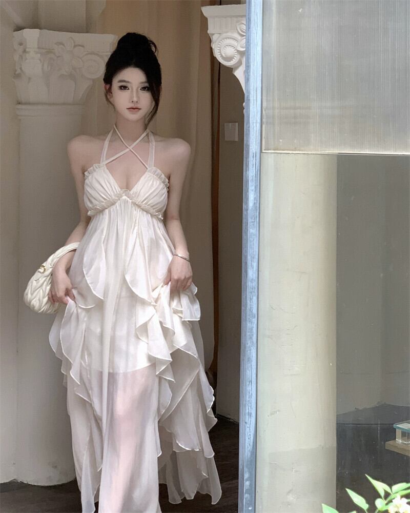 セクシーな気質重工業停止ネックサスペンダードレス女性の夏のロングドレスストラップレスバックレスウエストフリル A ラインスカート サマー 夏物 Aライン bstraw35524404747 | beaute25