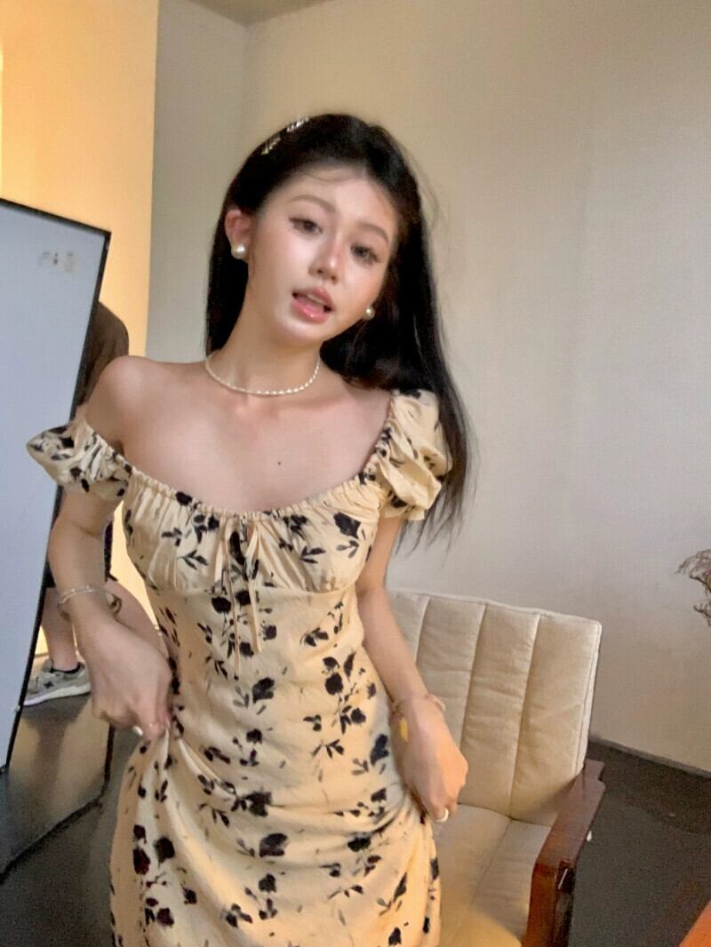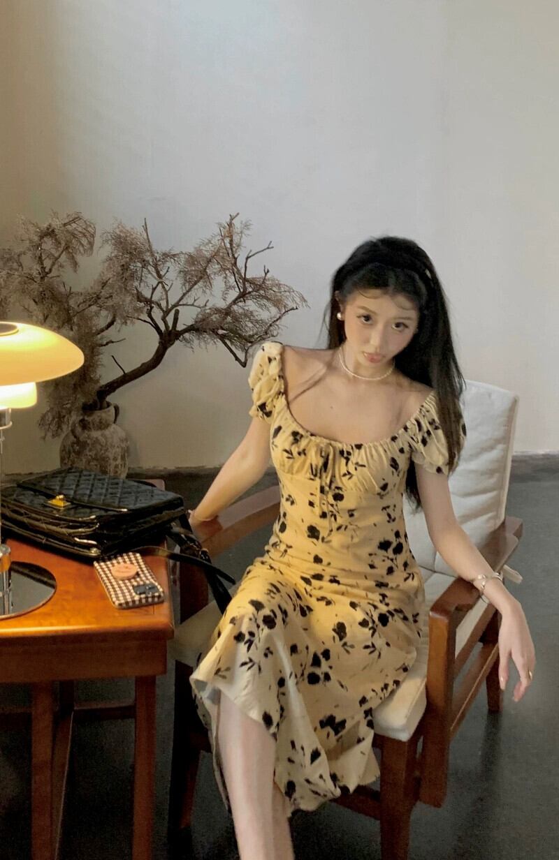 フレンチティーブレイクスクエアカラー花柄パフスリーブドレス女性の夏のウエスト痩身ストラップ気質バッグヒップスカートロングスカート サマー 夏物 スクウェア bstraw24253395103 | beaute25