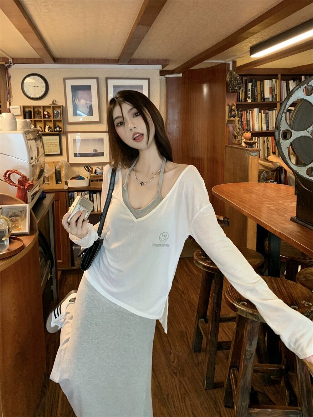 怠惰な V ネック白の薄い長袖 T シャツの女性の夏のデザインセンスニッチプルオーバールーズ日焼け止めブラウスロングトップ ホワイト サマー 夏物 Vネック Tシャツ bstraw1194478635 | beaute25