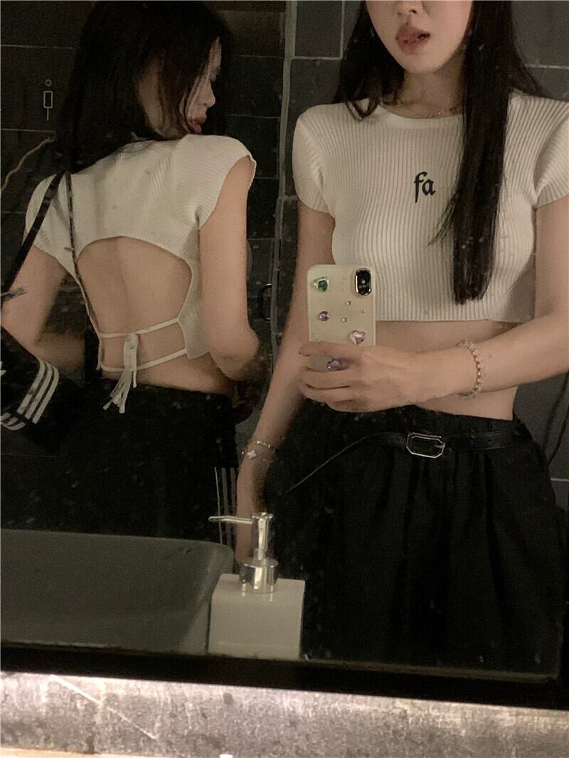 甘いスパイスガール白文字ニット半袖 Tシャツ女性の夏ショートバックレスストラップスリムウエストフロントショルダートップ ホワイト 大人ガーリー スウィート キュート カジュアル サマー 夏物 bstraw77631686912 | beaute25