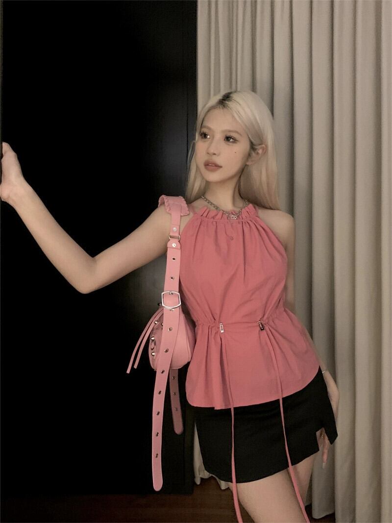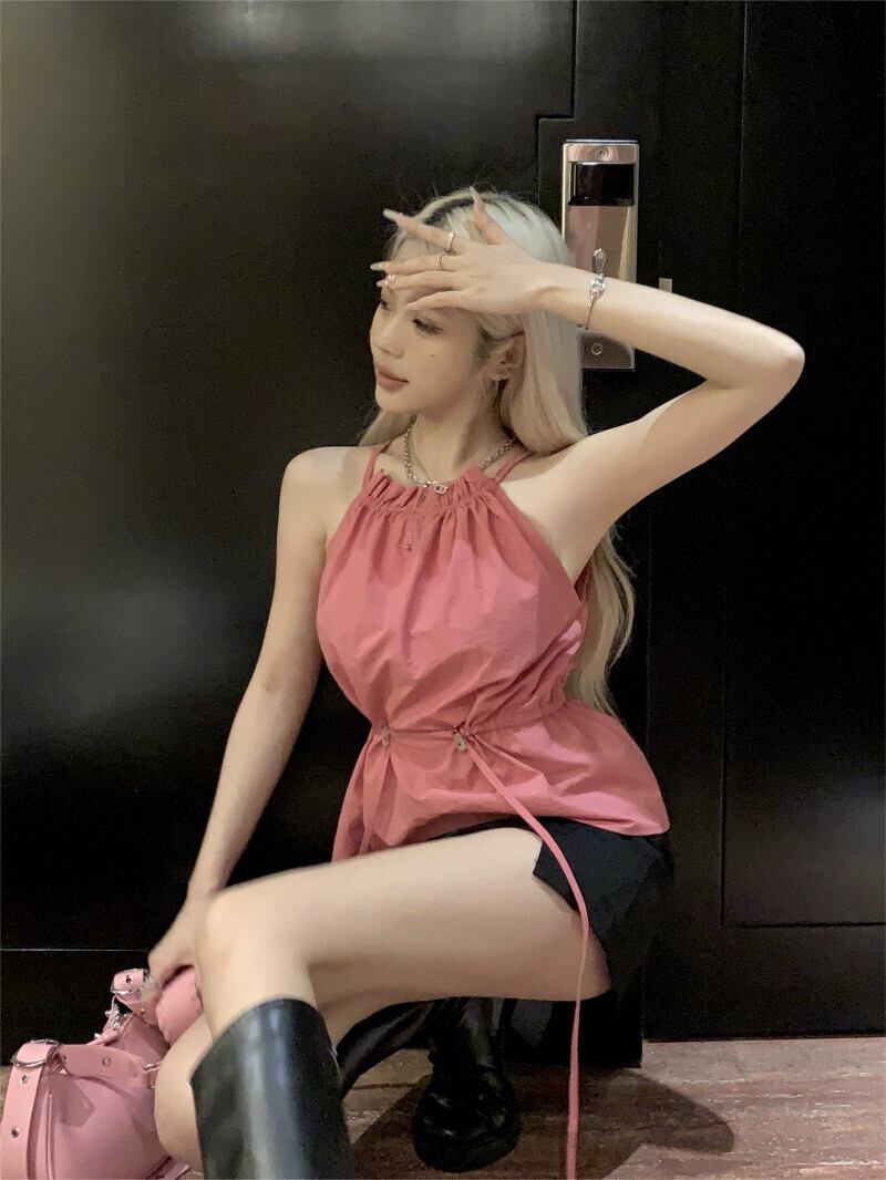 スイート スパイス ガール ピンク ホルターネック キャミソール 小さなベスト レディース 夏 アウター 巾着 ノースリーブ ショート フレンチ スリム トップ 大人ガーリー スウィート キュート カジュアル サマー 夏物 bstraw152953052 | beaute25