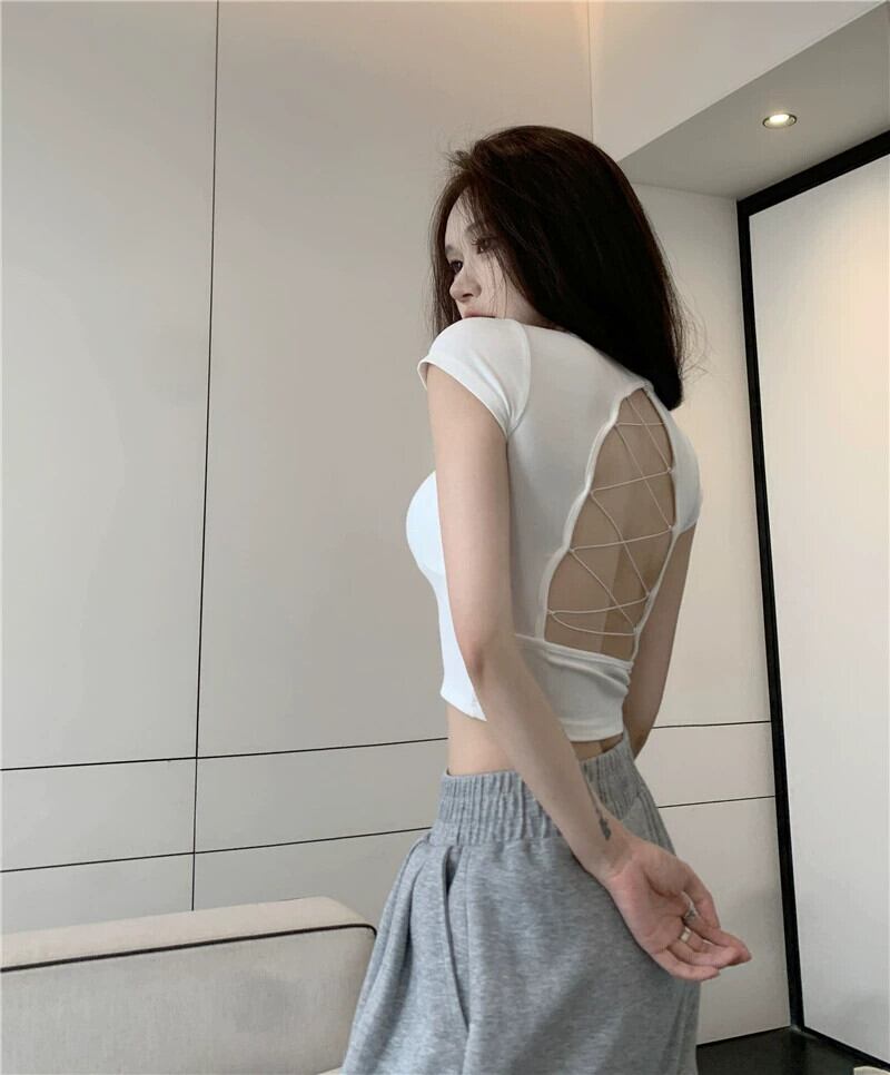 白い背中の開いた半袖Tシャツ女性の夏甘い小さな背中中空デザインセンスニッチショートトップ ホワイト 大人ガーリー スウィート キュート カジュアル サマー 夏物 bstraw54722631191 | beaute25