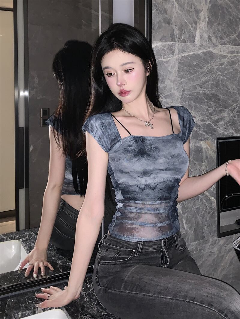 甘いインクプリント半袖 Tシャツの女性の夏フェイクツーピーススクエアカラーメッシュタイダイショートボトリングシャツトップ 大人ガーリー スウィート キュート カジュアル サマー 夏物 スクウェア bstraw22062459571 | beaute25
