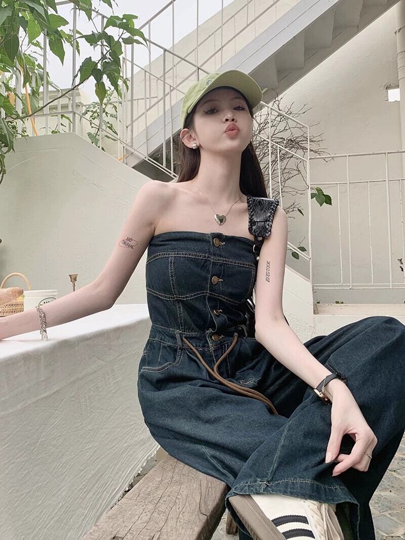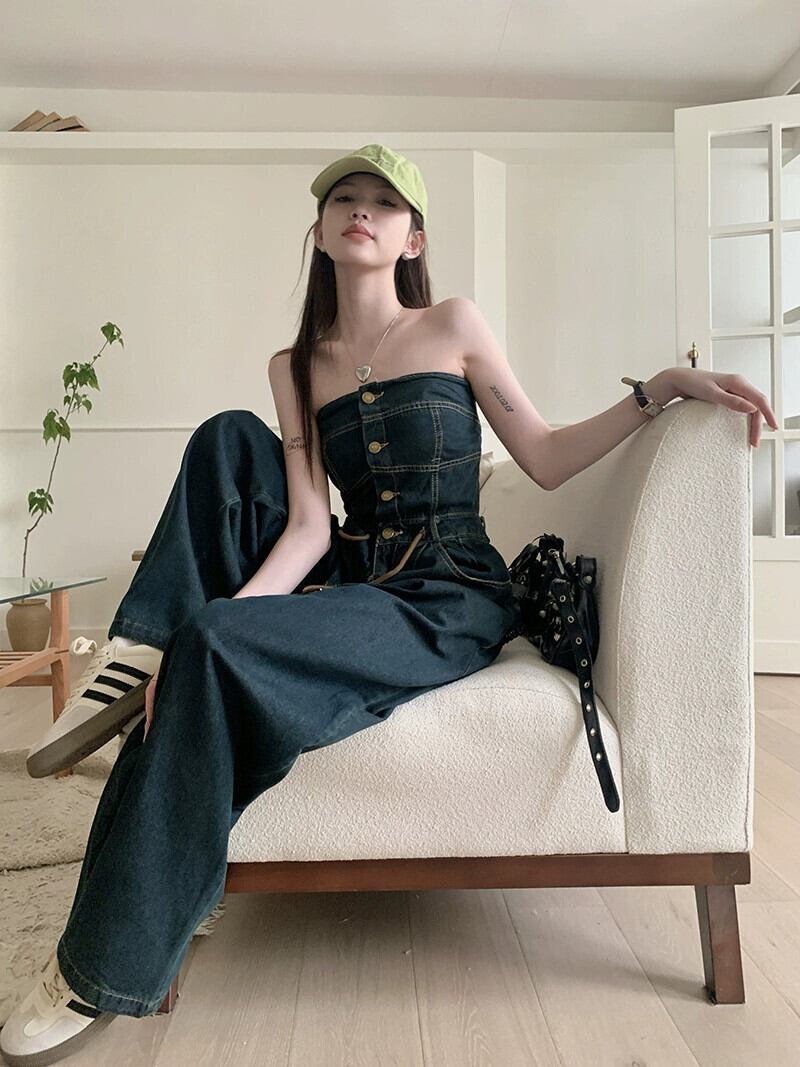 香港スタイルのレトロなチューブトップデニムジャンプスーツの女性の夏ハイウエストストラップストレートパンツワイドレッグモップジャンプスーツパンツ ハイウェスト サマー 夏物 ワイドパンツ bstraw91394136933 | beaute25