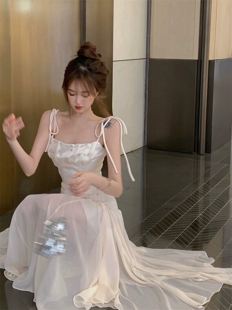 フランスの気質ラインストーンスリングドレス女性の夏のストラップウエストネットガーゼスプライシングaラインロングスカートセクシーなスカート サマー 夏物 bstraw62168094483 | beaute25
