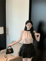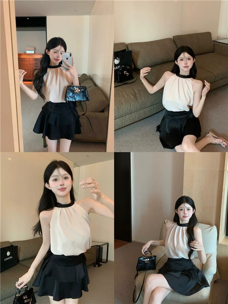 フレンチツーピースノースリーブホルターネックトップ女性の夏の黒のaラインスカートスカートショートスカート気質レディスーツ ブラック サマー 夏物 bstraw67681323443 | beaute25