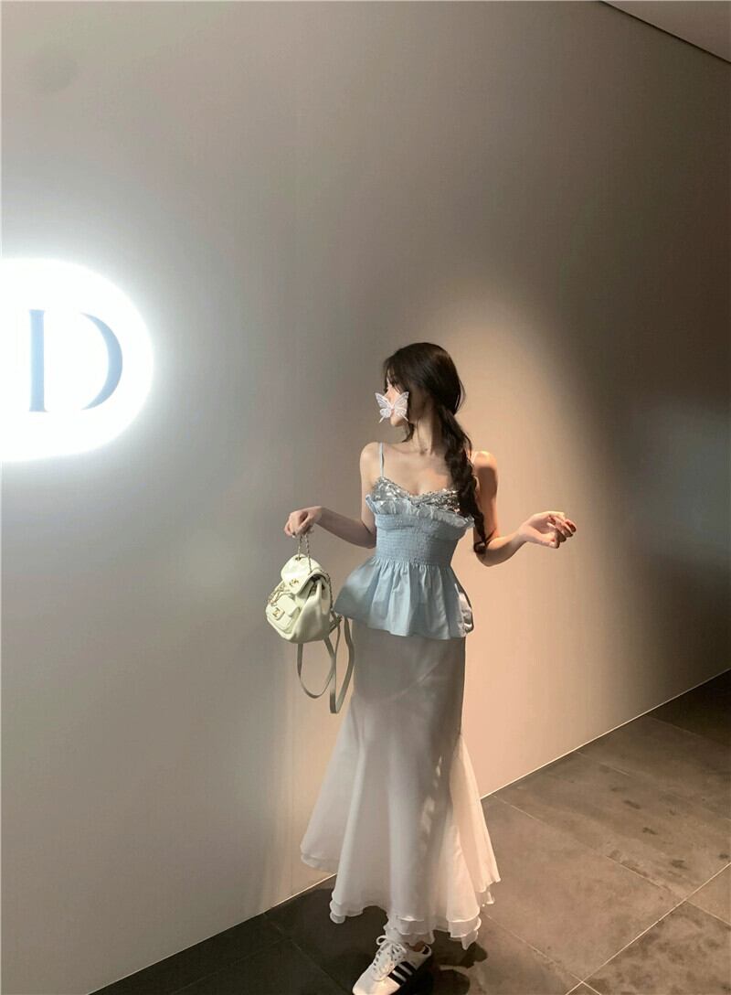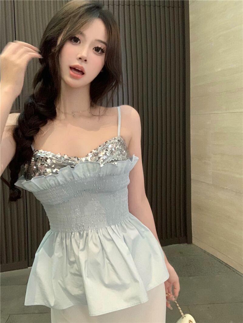 純粋な欲望スパンコールステッチブルーキャミソールレディース夏ショートウエスト甘いフリルホルタートップアウター 大人ガーリー スウィート キュート カジュアル サマー 夏物 bstraw78107219225 | beaute25