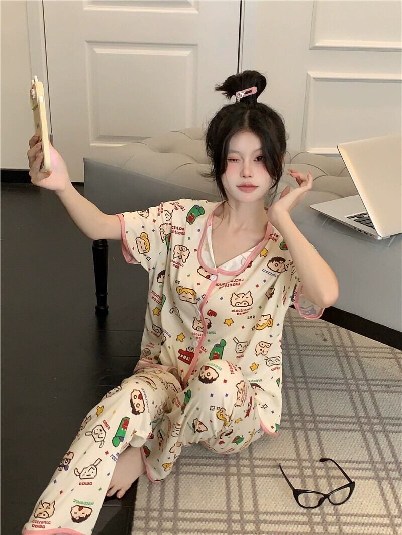 甘いクレヨンしんちゃん漫画プリント半袖パジャマセット女性の夏のホームウェアパジャマパンツズボン 3 点セット 大人ガーリー スウィート キュート カジュアル サマー 夏物 bstraw74018444457 | beaute25