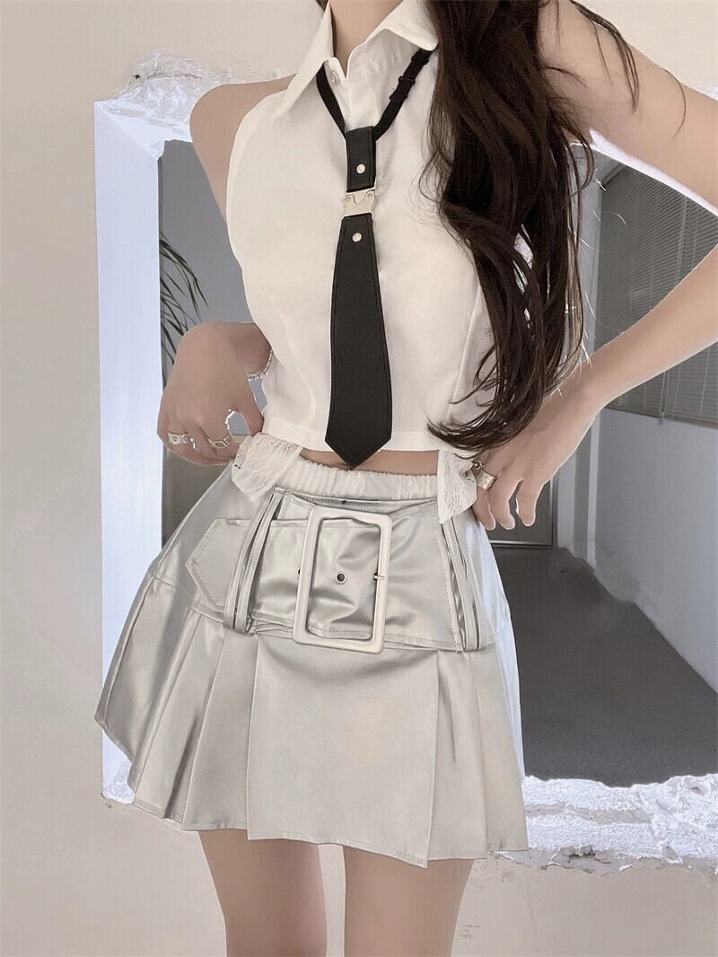 色:黒のネクタイ,ホワイトトップ,シルバースカート