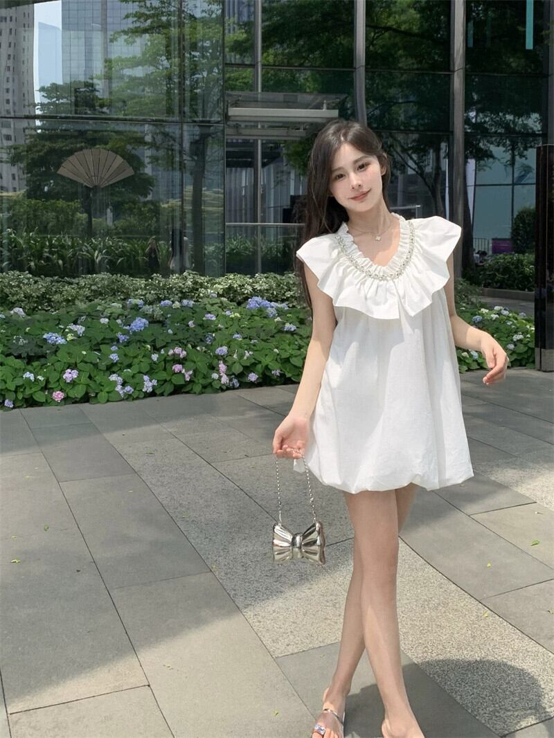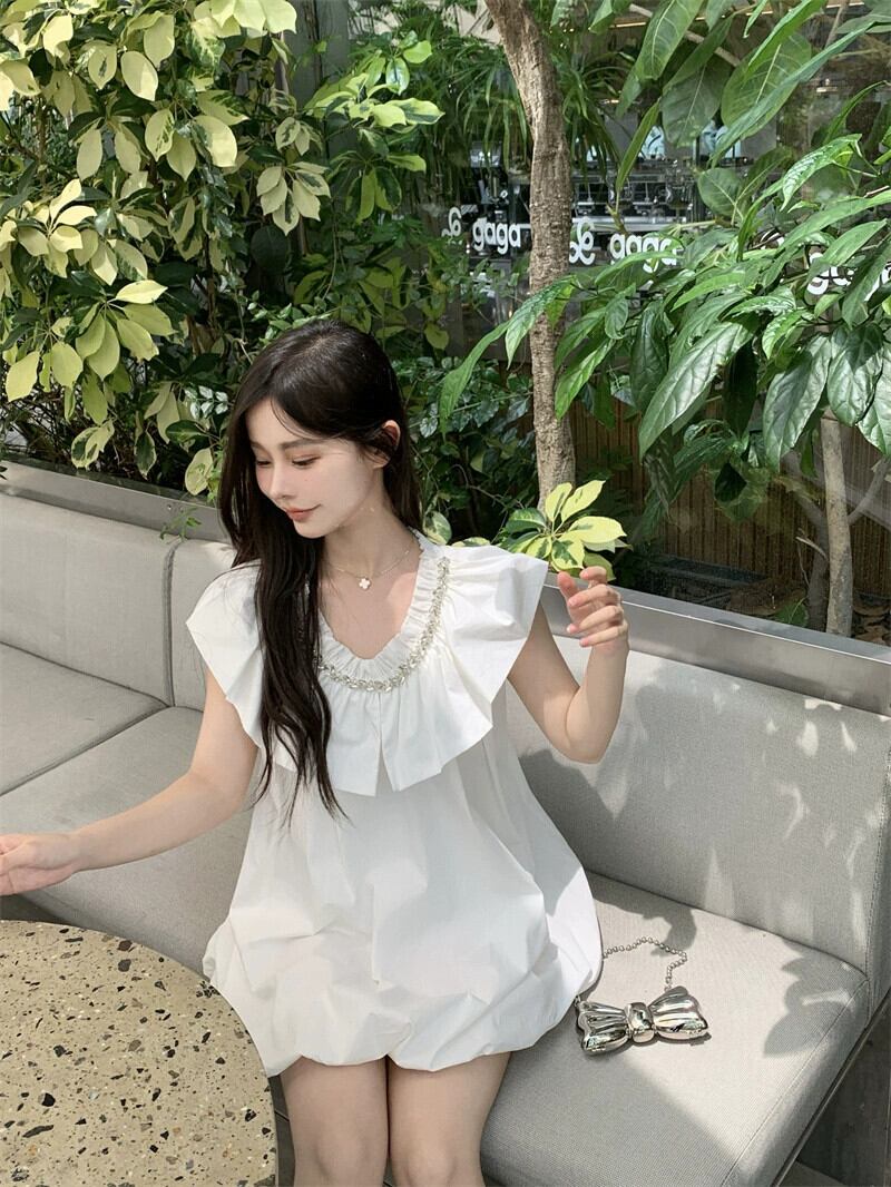 甘い気質の白い蓮の葉のドレス女性の夏の人形の襟ラインストーンのつぼみスカート小さなaラインスカート ホワイト 大人ガーリー スウィート キュート カジュアル サマー 夏物 bstraw98994688097 | beaute25
