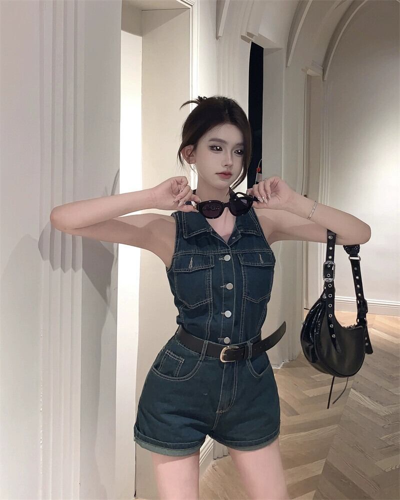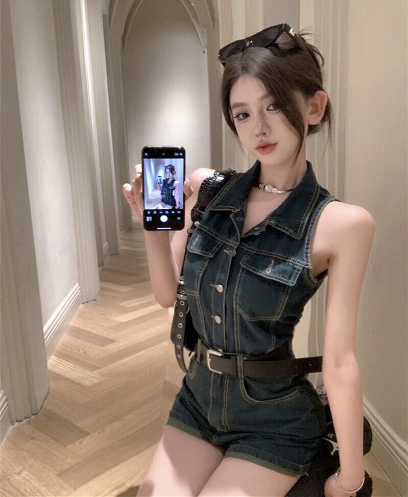 レトロな香港スタイルのデニムスーツの女性のブルーノースリーブホルターベストベスト夏ウエストストレートショーツ 2 点セット サマー 夏物 ブルマー bstraw63691329318 | beaute25