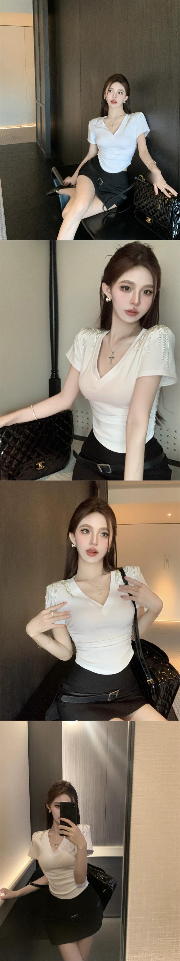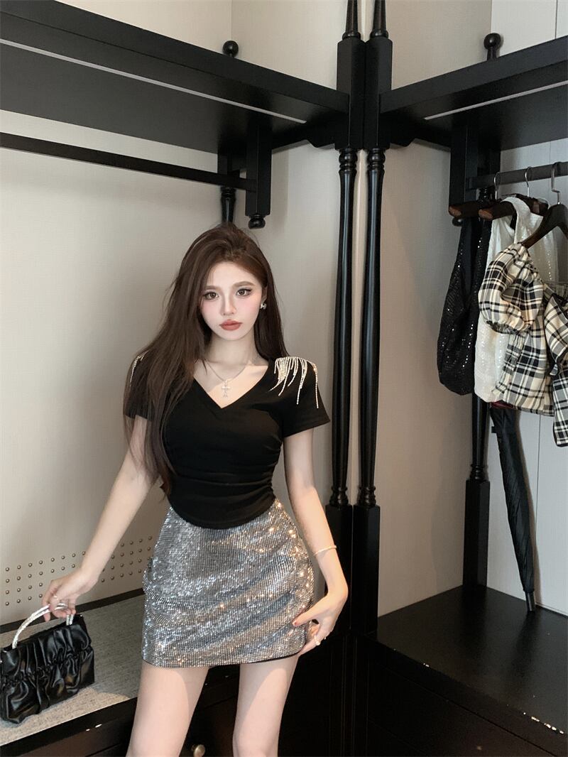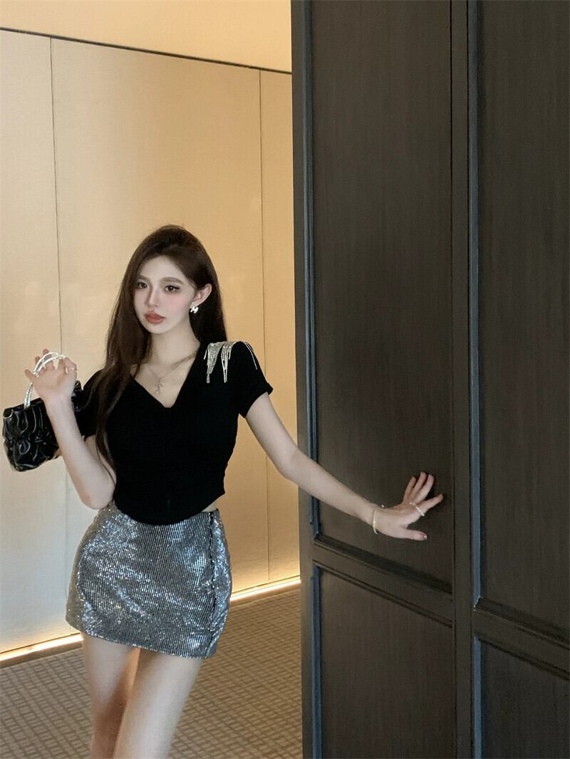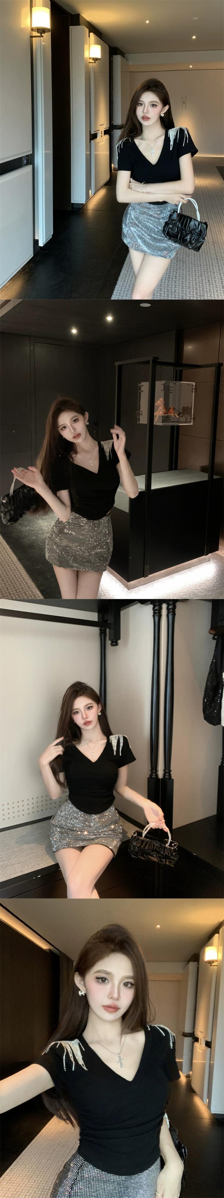 黒の V ネック半袖 T シャツの女性の夏甘い重工業テル デザイン不規則な底シャツ ショート トップ ブラック 大人ガーリー スウィート キュート カジュアル サマー 夏物 Vネック Tシャツ bstraw3791427108 | beaute25
