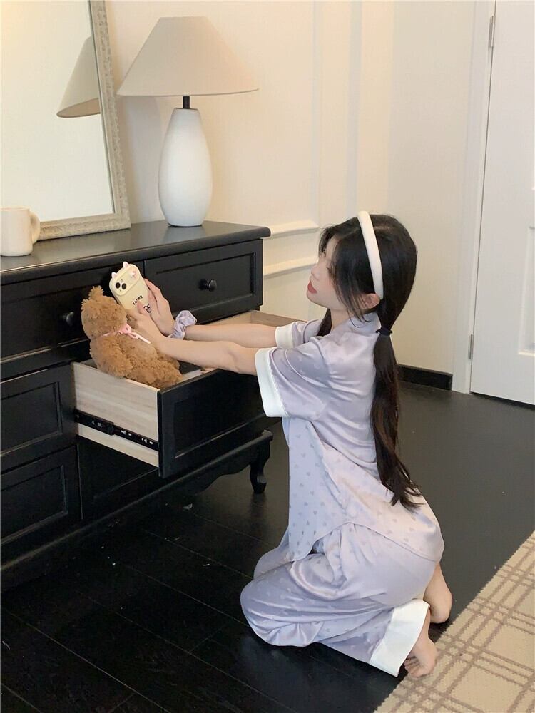 アイスシルク薄部半袖パジャマ女性の夏の 2023 新しいスタイルは屋外で着用可能ホーム服スーツパジャマパンツズボン 2 点セット サマー 夏物 bstraw47765145936 | beaute25