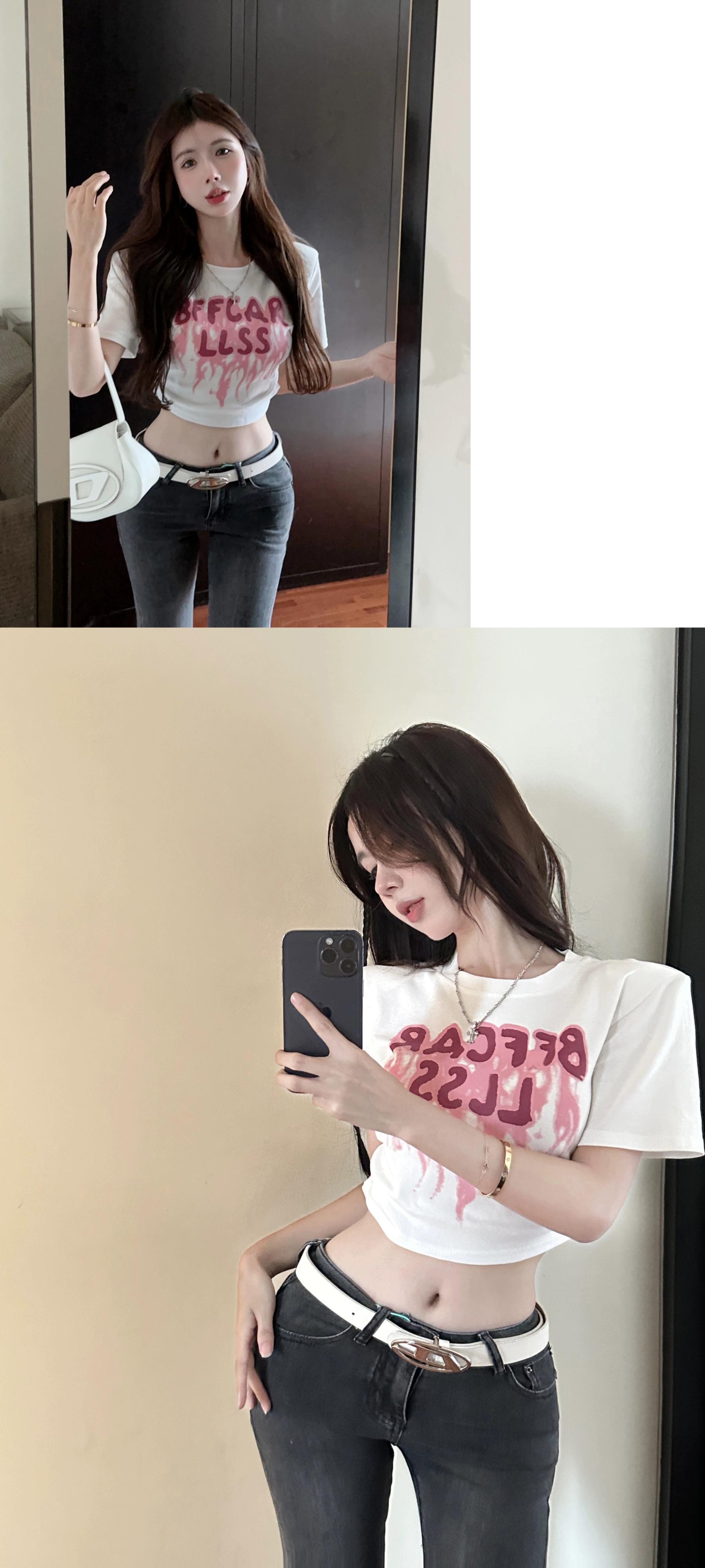 ホワイトレタープリントフロントショルダー半袖Tシャツレディースサマースイートスリムフィットスモールウエストショートトップ 大人ガーリー スウィート キュート カジュアル 夏物 bstraw59314941210 | beaute25