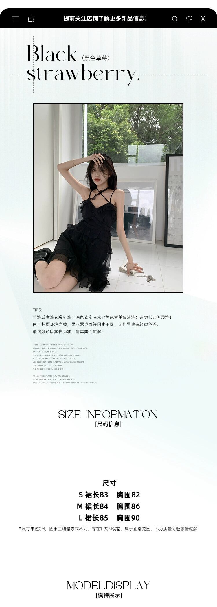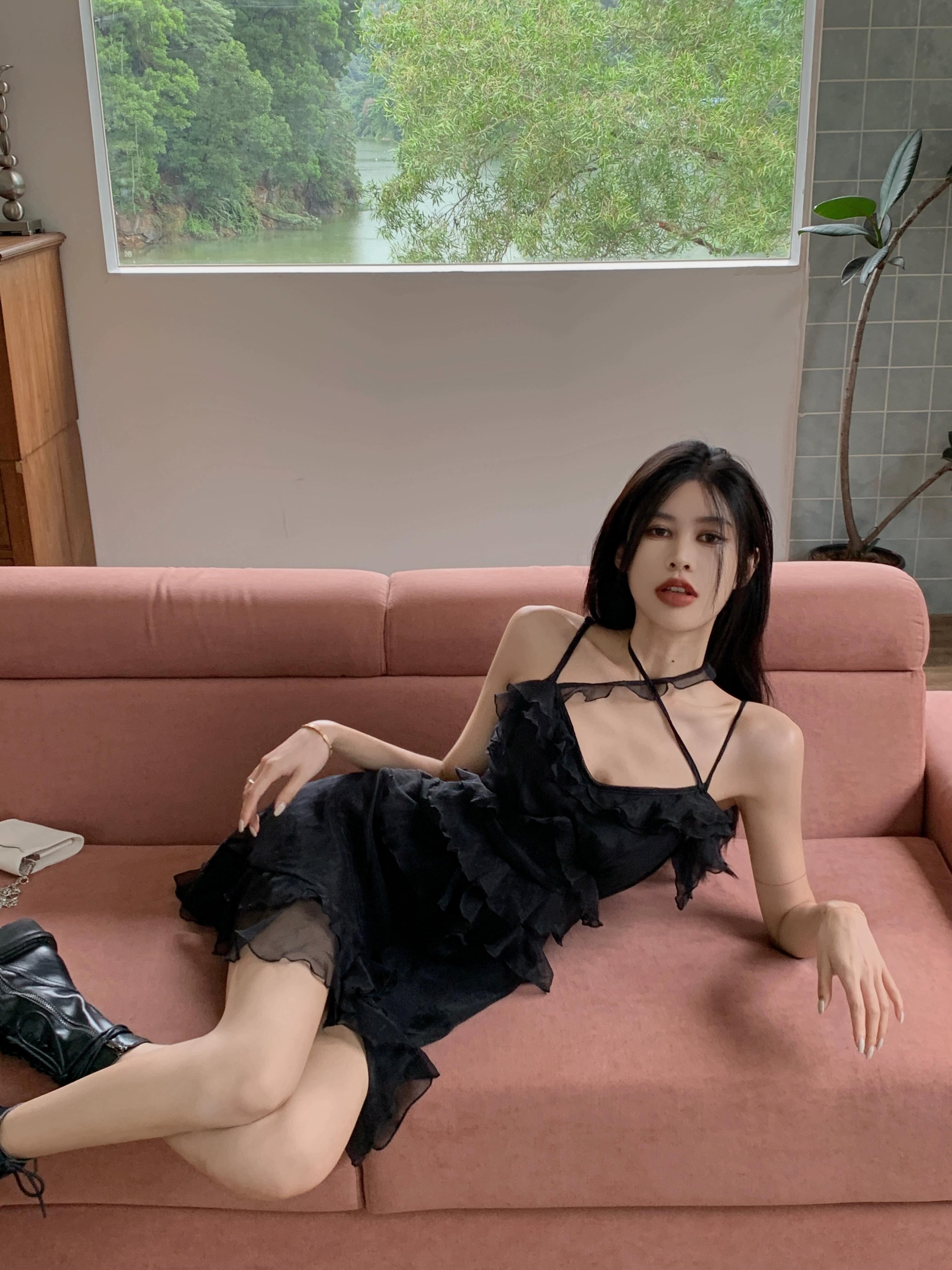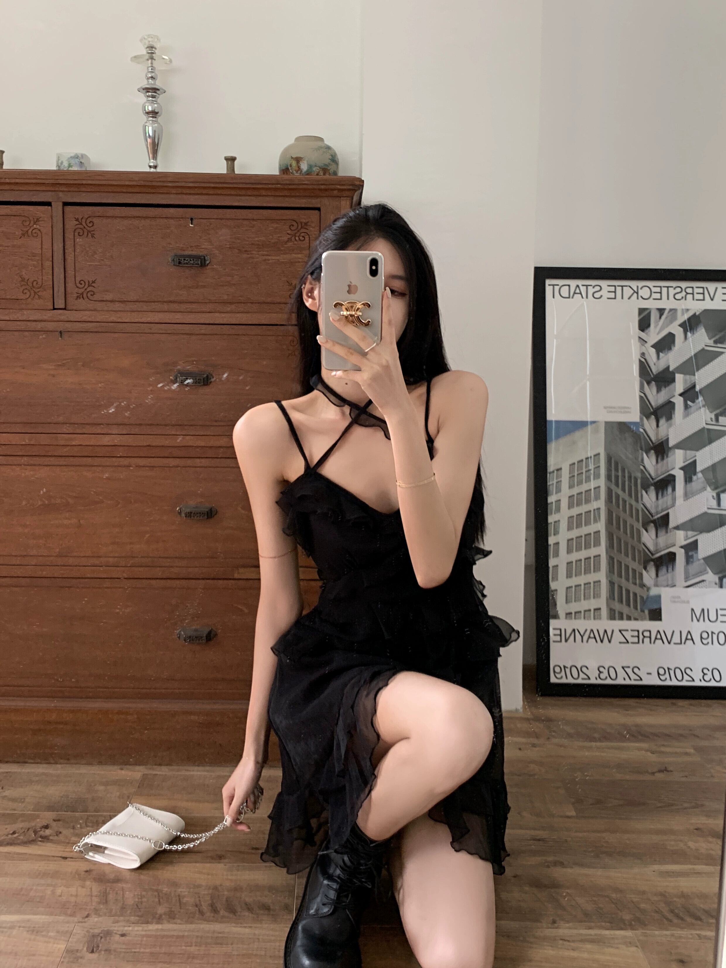 黒のセクシーな吊りネックサスペンダードレス女性の夏の甘い v ネック気質フリルスカートウエストスカート ブラック 大人ガーリー スウィート キュート カジュアル サマー 夏物 Vネック bstraw502723780 | beaute25