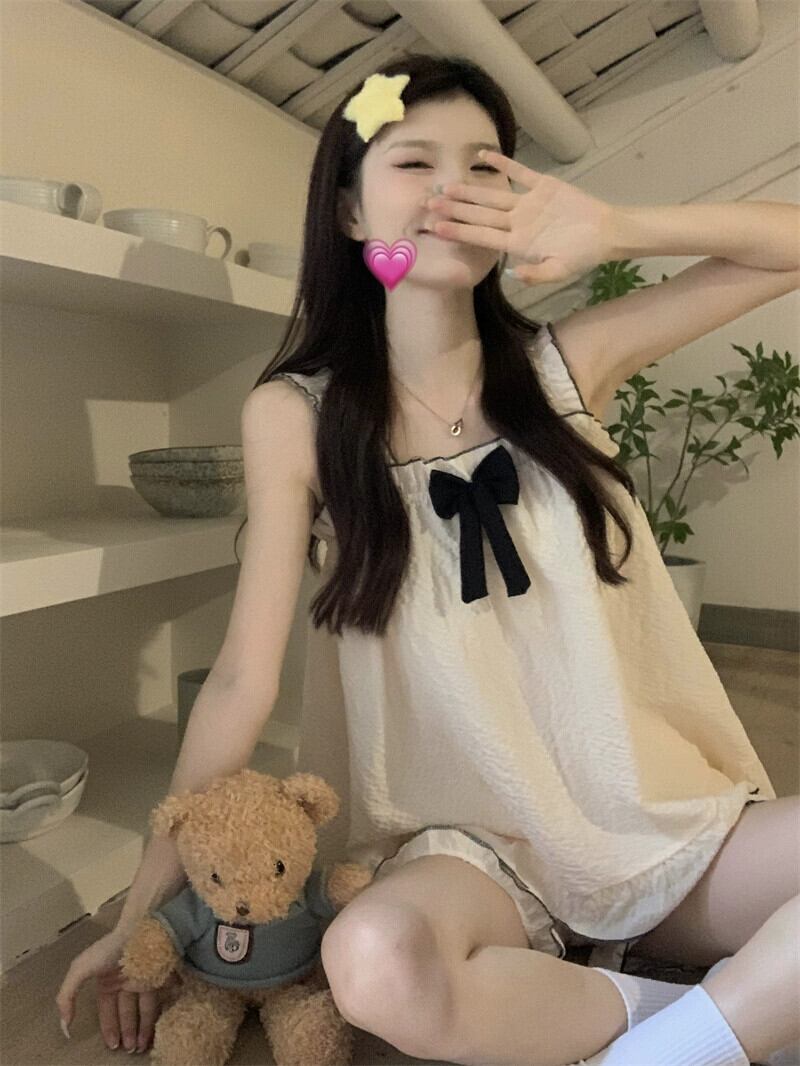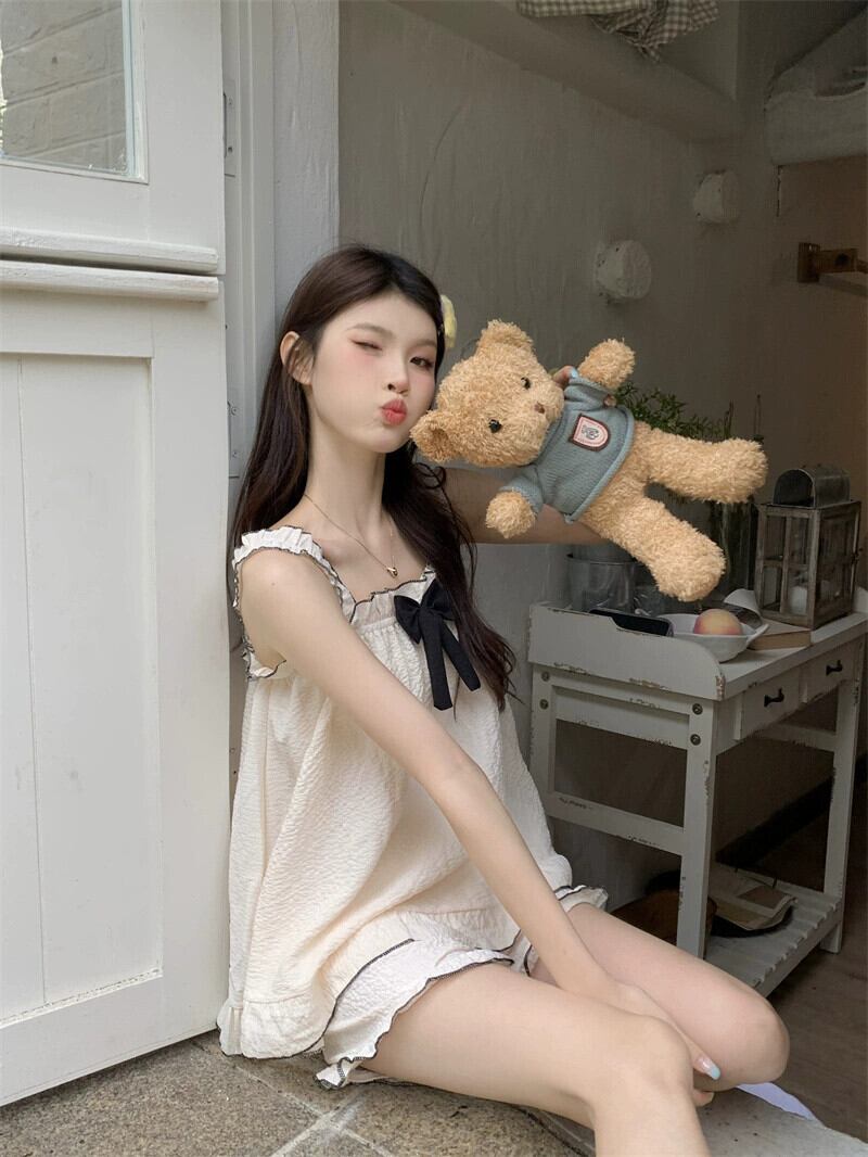甘いリボンフリルスリングパジャマ女性は夏にパジャマパンツショートパンツツーピースホームサービススーツを着用できます ラッフル 大人ガーリー スウィート キュート カジュアル サマー 夏物 ショーツ ブルマー bstraw41593578158 | beaute25