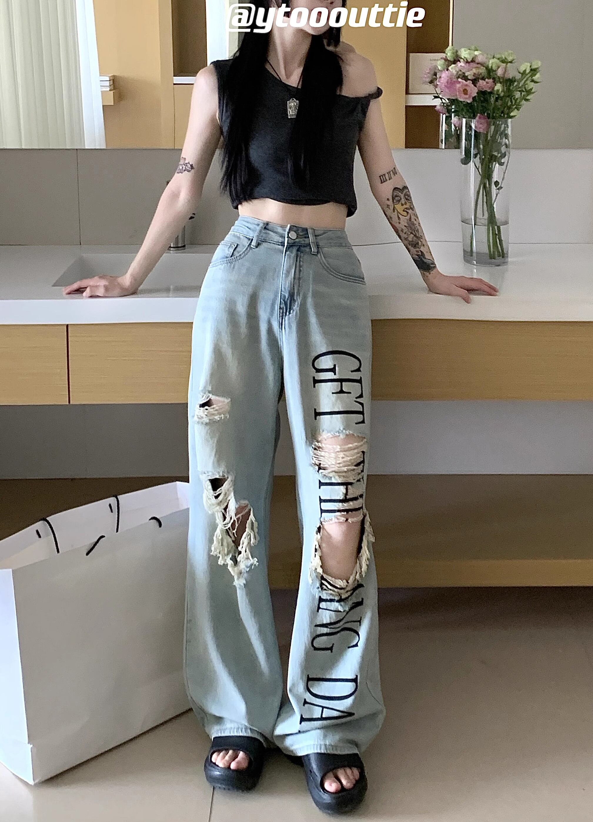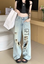 ブルーレターウォッシュストレートジーンズレディース夏ハイウエスト小男穴ルーズワイドレッグパンツズボントレンディ ハイウェスト サマー 夏物 ワイドパンツ bstraw68119932420 | beaute25