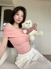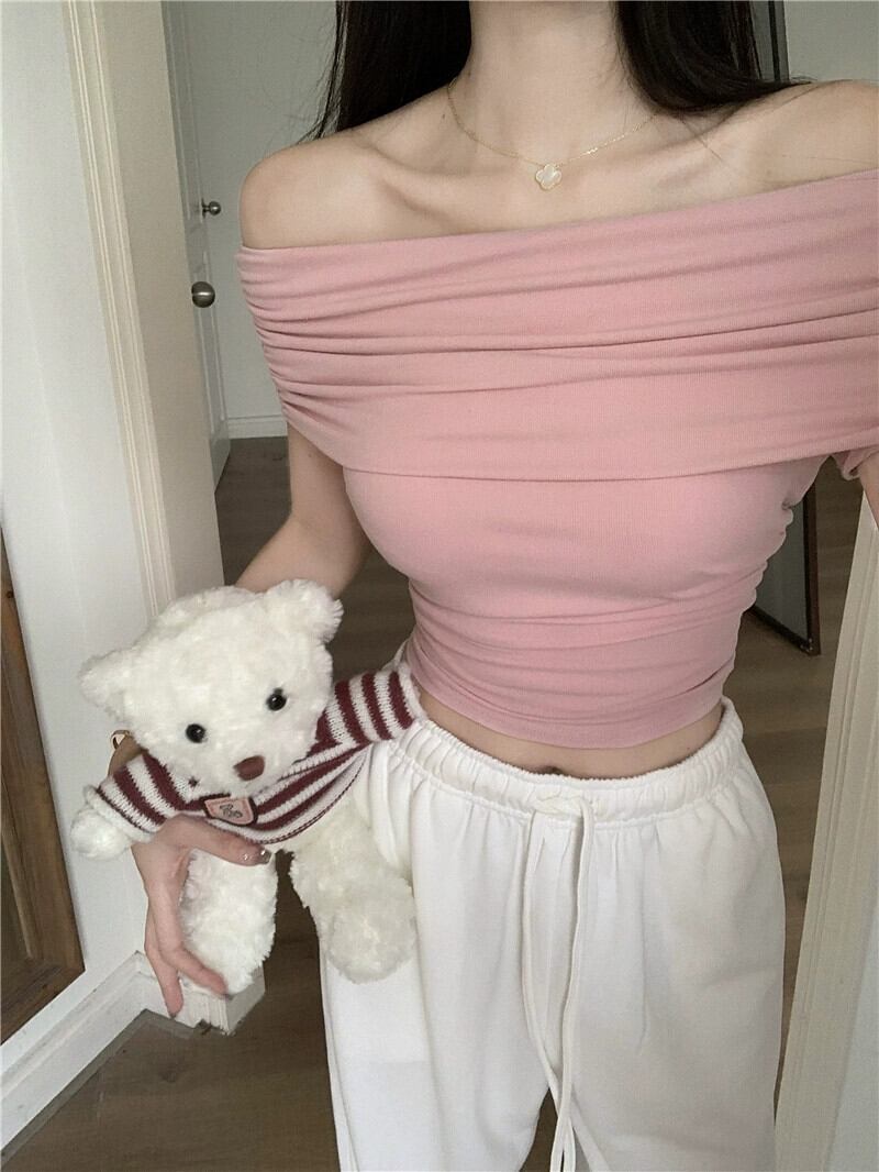 純粋な欲望ワンショルダー半袖 T シャツの女性の 2023 夏の新しいピンクのセクシーなオフショルダー スリム ショート トップ サマー 夏物 Tシャツ bstraw6696811948 | beaute25