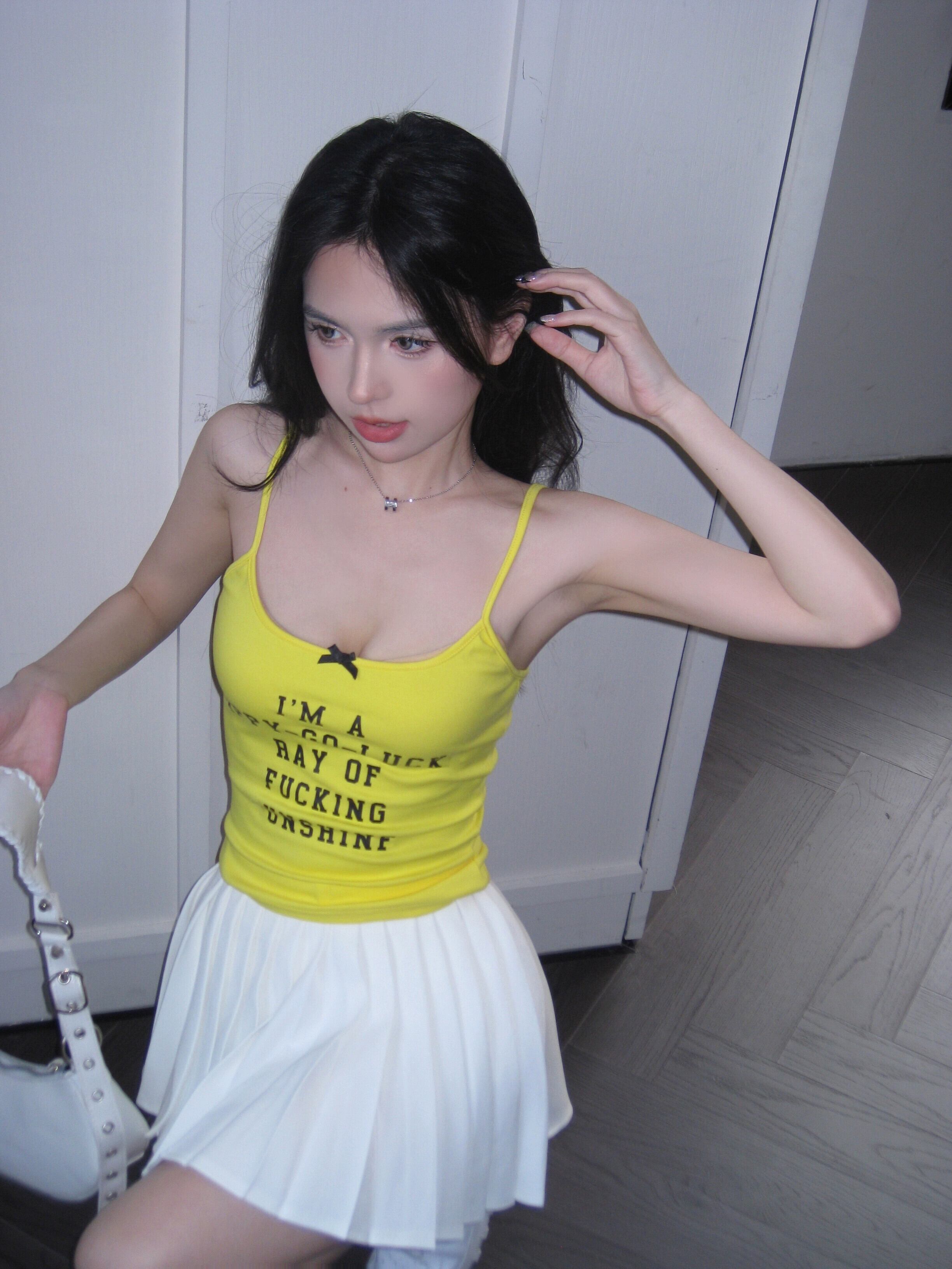 色:黄色のサスペンダー,白いスカート
