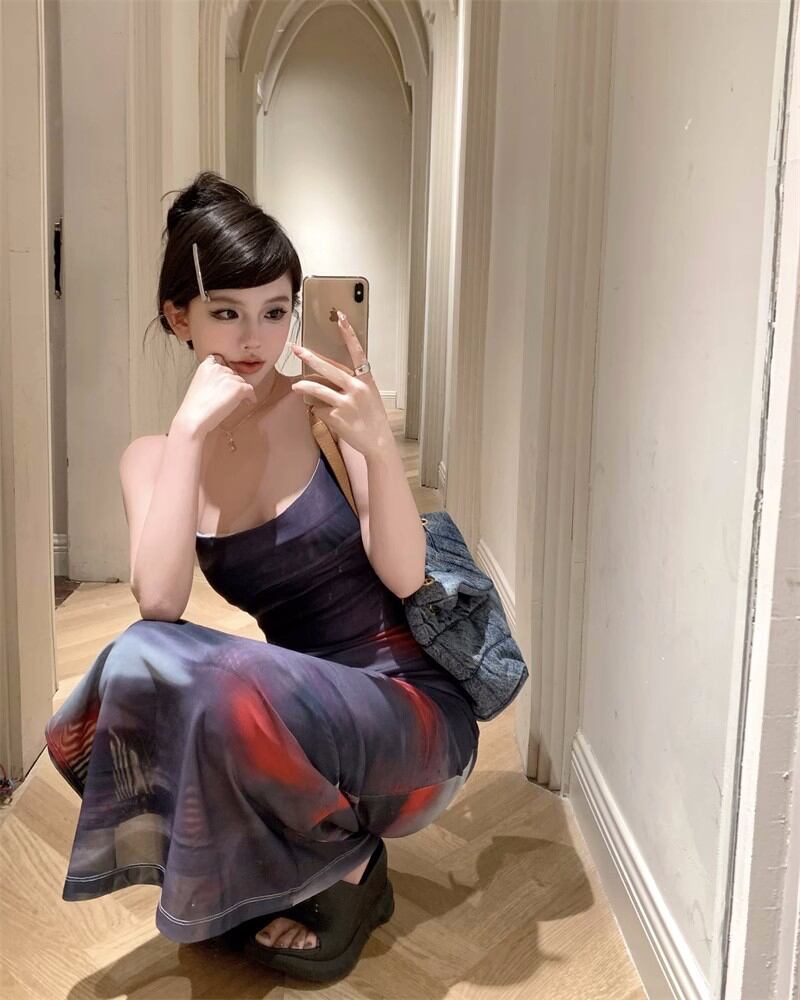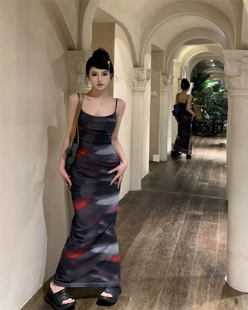 タイダイサスペンダードレス夏ノースリーブウエストバッグヒップミッドレングススカート女の子セクシーなオープンバックスリムマーメイドスカート サマー 夏物 bstraw32477578268 | beaute25