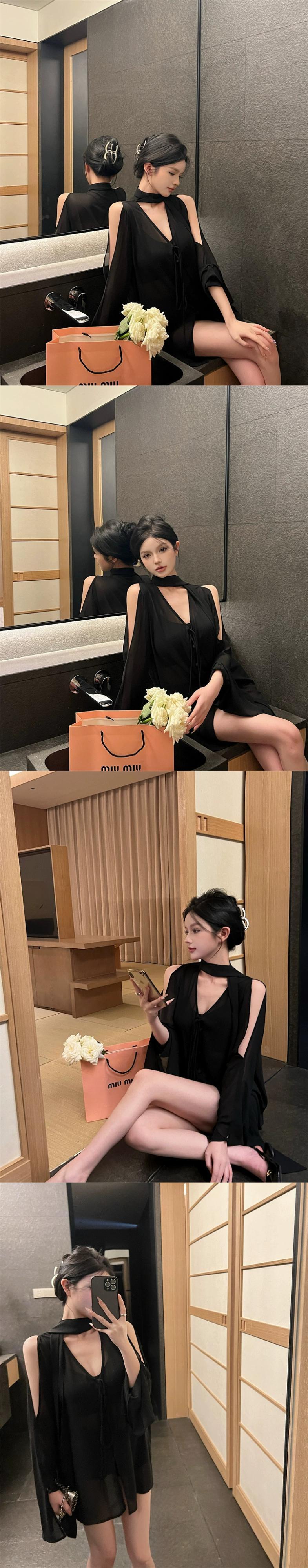 黒の V ネック中空オフショルダー長袖シフォンシャツ女性の夏掘り肩気質デザインセンスニッチシャツトップ ロング ブラック サマー 夏物 Vネック bstraw51632565169 | beaute25