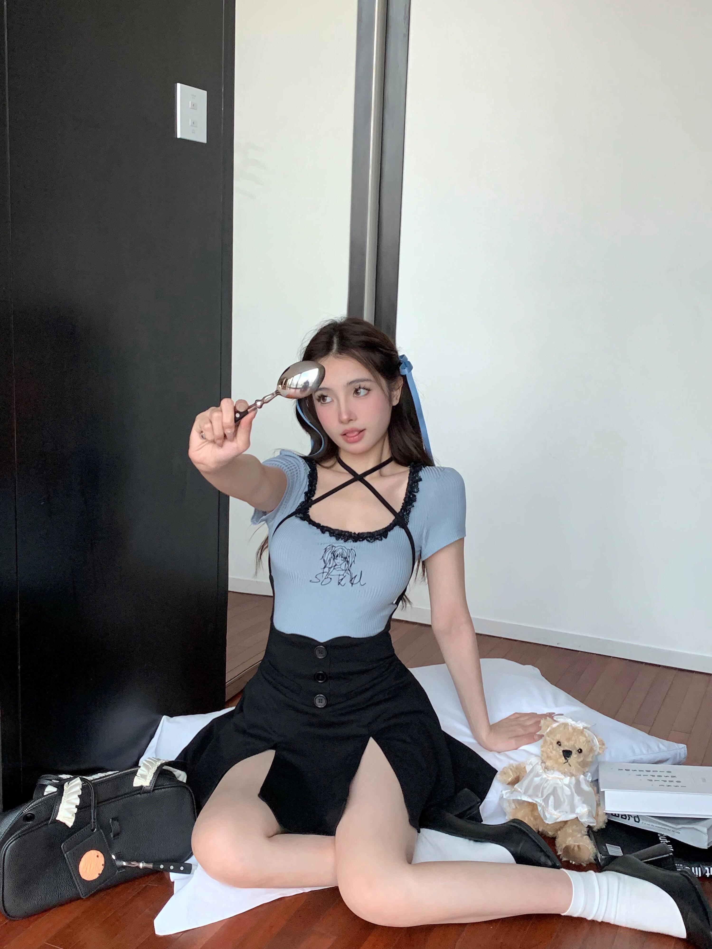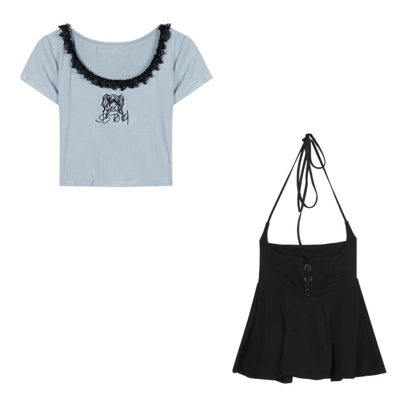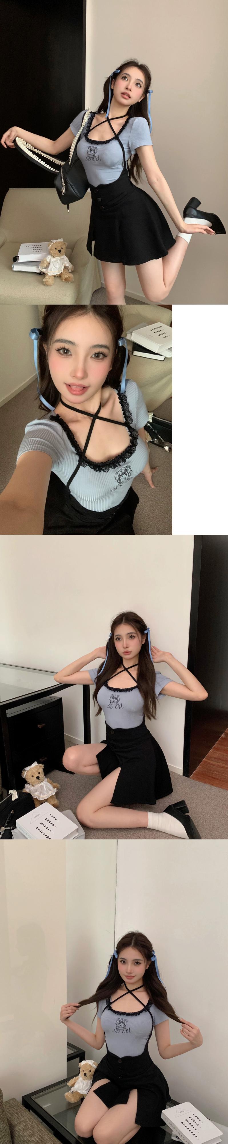 スプライシングとコントラストカラーレーススクエアカラー半袖Tシャツレディース夏純粋な欲望スタイルタイトフィットショートブルートップ サマー 夏物 ピュア スクウェア bstraw58507408700 | beaute25