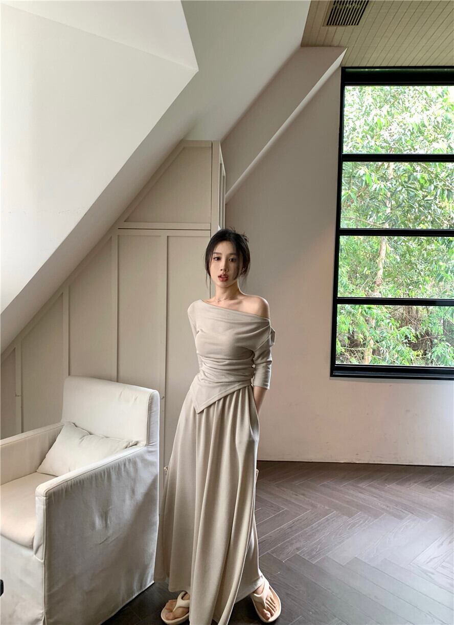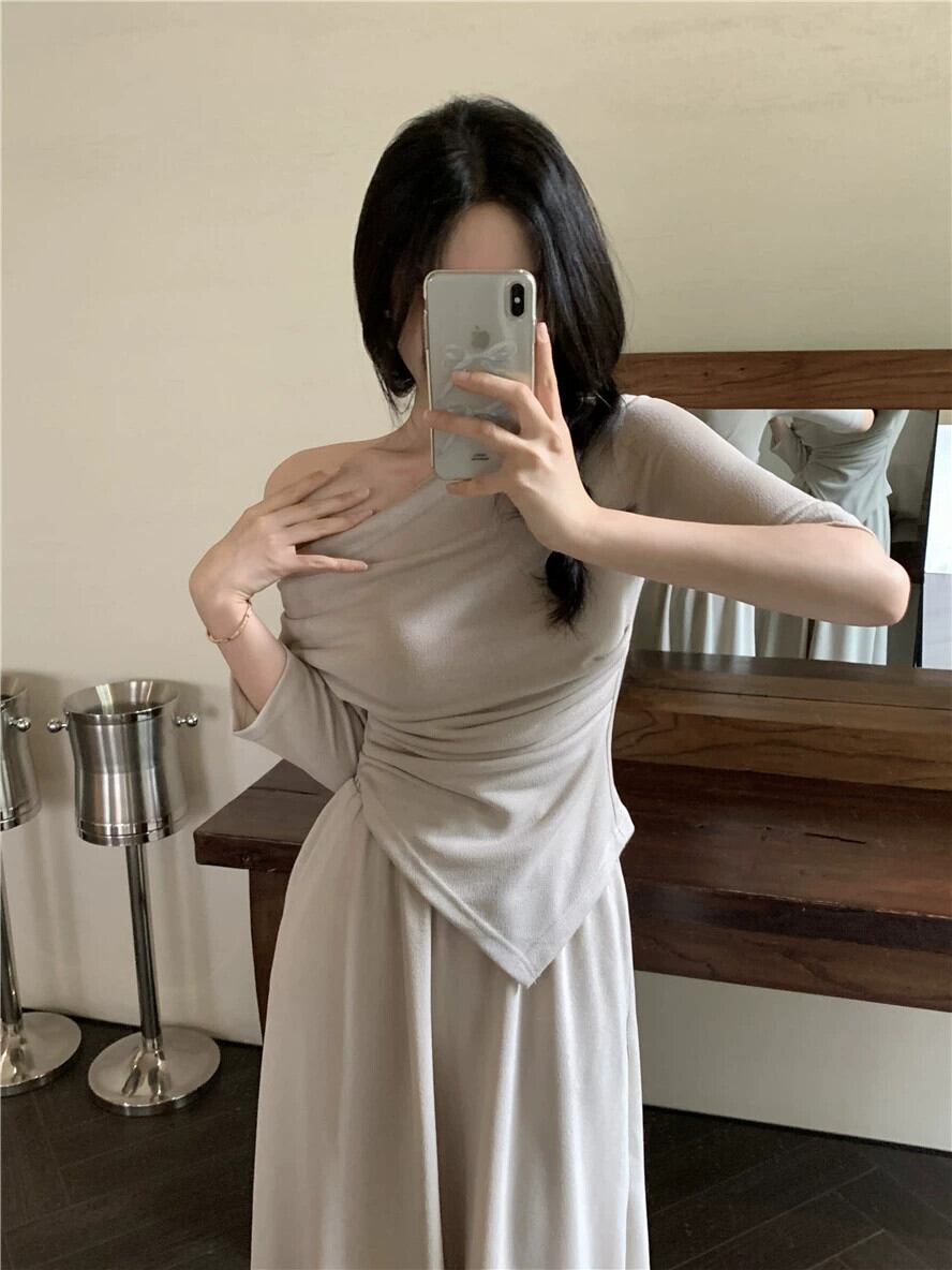 Yujie ライトおなじみの風スーツスカート不規則な長袖日焼け止めトップハイウエストストレートスカートツーピース夏の女性 ハイウェスト ロング サマー 夏物 bstraw1903539471 | beaute25