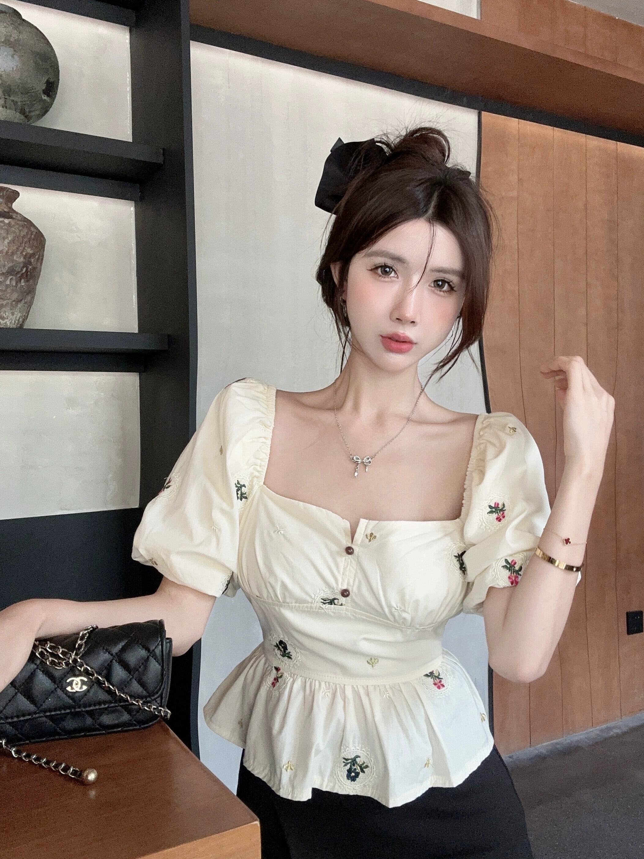 フレンチスイート刺繍半袖シャツレディース夏スクエアカラーパフスリーブシャツウエストショートニッチシックトップ 大人ガーリー スウィート キュート カジュアル サマー 夏物 スクウェア bstraw87473788719 | beaute25