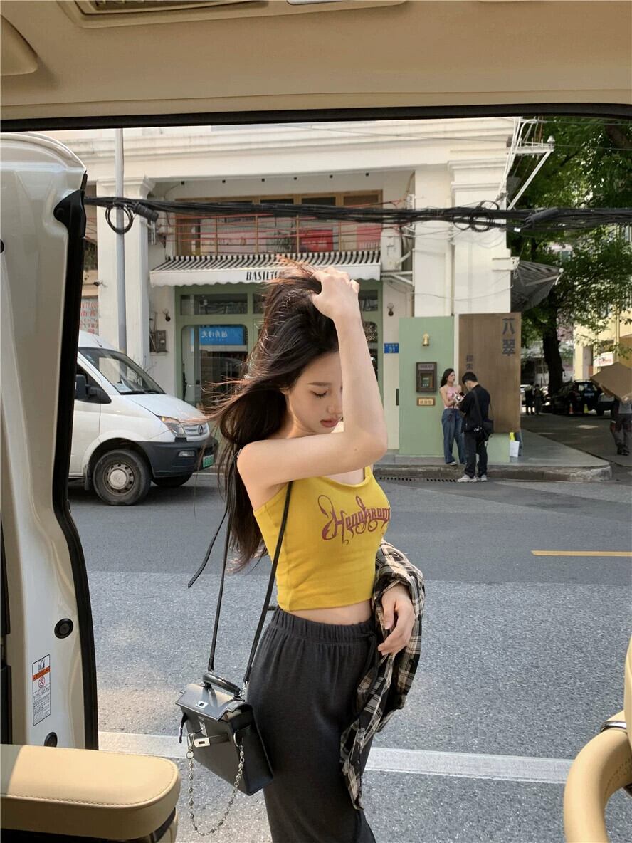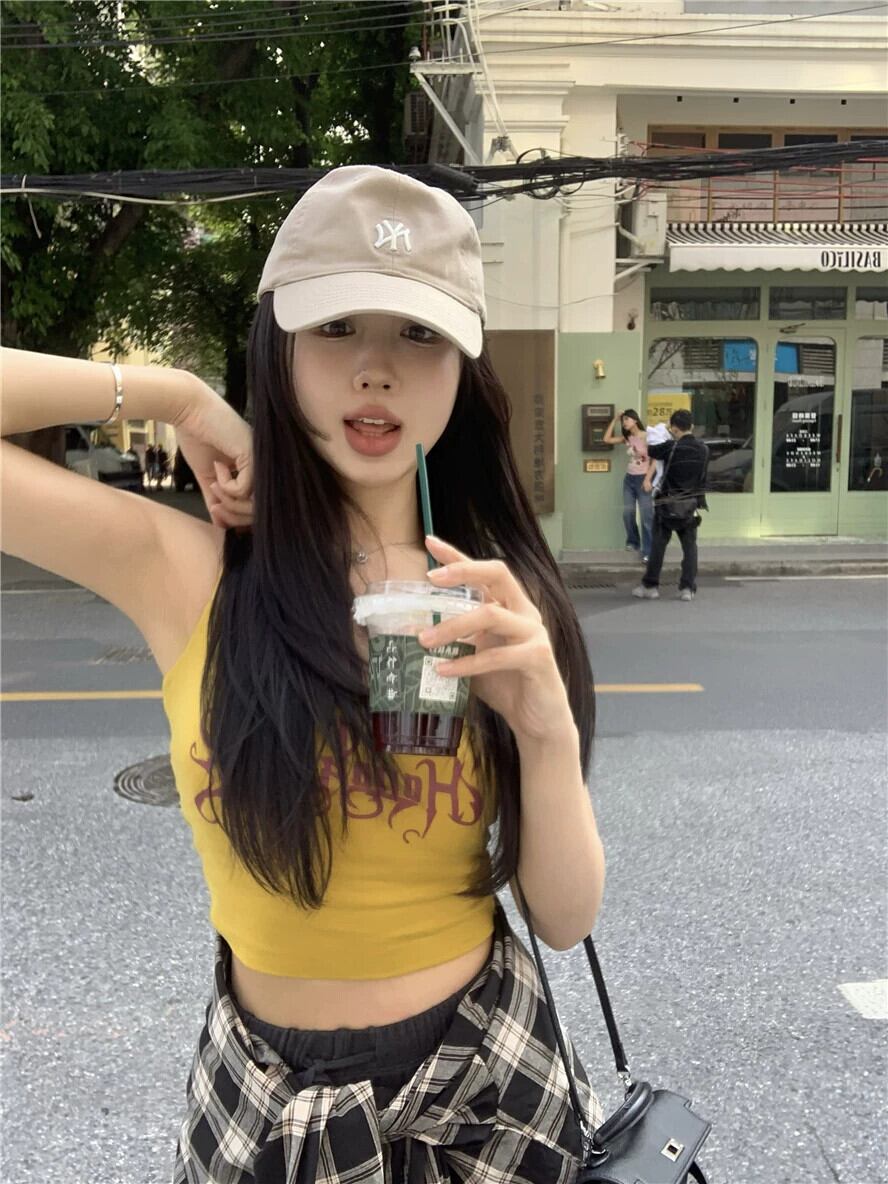 胸パッド付きプリントベスト、小さめサスペンダー、レディース夏、イエロー、スリム、薄手、ショート、甘い、トップス 大人ガーリー スウィート キュート カジュアル サマー 夏物 bstraw980701426 | beaute25
